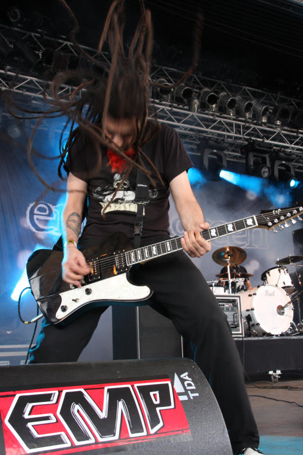Deutschlands beste Gothic Rock-Band heißt END OF GREEN und rockt an diesem Nachmittag gleich mal mit drei Gitarren los. Geschmackssicher präsentiert sich der dreadgelockte Gitarrist Sad Sir im Nachtmystium-Shirt und schüttelt seine Haare genauso fleißig, wie der zweite Klampfer Kirk Kerker. Neun Songs gibt die Band um den mit Grabesstimme singenden Frontmann Michelle Darkness zum Besten, darunter auch das brandneue "Goodnight Insomnia" sowie Hits à la "Killhoney", "Drink Myself To Sleep" und das alte "Nice Day To Die". Wo andere Gothic Rock-Bands weinerliches Geplänkel von sich geben,