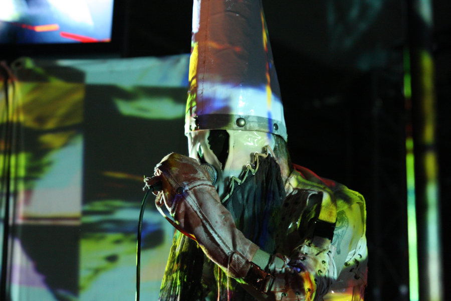 Spitzhut, verbundene Hände und ein ebenso verhüllter Körper sowie zahlreiche Blutflecken machen das Outfit aus und in Verbindung mit der Lichtinstallation sowie der Musik fühlt man sich wie in einem Horrorfilm oder einem bösen Alptraum. Die Singles "Addiction" und "Dogshit" folgen und im Verlauf des 80-minütigen Sets kommt man sich immer mehr wie im Rausch vor. In ohrenbetäubender Lautstärke werden "Tormentor", "Pro-Test" und "Ugli" ins Publikum gedroschen, das dann bei "Assimilate" endgültig austickt. Erst zu den Zugaben erscheint Ogre ohne Maske auf der Bühne und kündigt den Übersong "Worlock" an. Mit "Brap" und "Shore Lined Poison" wird das entrückte Publikum dann in die kühle Kölner Nacht entlassen. Was für ein wahnwitzig guter Auftritt - es erscheint unmöglich, da noch einen drauf zu setzen.