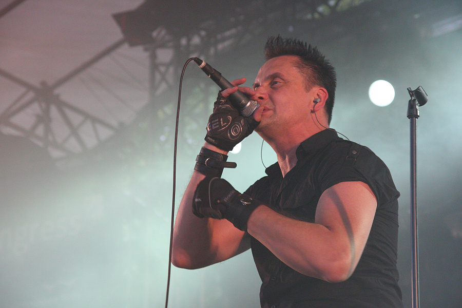 Amphi Festival 2011Um kurz vor 19 Uhr bitten DIE KRUPPS zum Tanz und haben sich dafür ein hübsches Best Of-Set zurecht gelegt. Wer befürchtet, dass man nach der letzten Veröffentlichung auf eine Gitarre auf der Bühne verzichten würde, sieht sich zum Glück getäuscht und so brechen Hits wie "Isolation", "Crossfire", "To The Hilt", "Fatherland" und "Bloodsuckers" mit der ihnen gebührenden Härte über das Publikum herein. Gut, an der Gitarre Lee Altus zu sehen, wäre zwar noch schöner, aber Marcel Zürcher macht seinen Job ebenfalls ganz ordentlich. Zwischendurch trommelt der souveräne und agile Frontmann Jürgen Engler bei "Amboss" passend auf den Metallrohren, die vor ihm aufgebaut sind, während die EBM-Fans sich über ganz alte Klassiker wie "Germaniac" und natürlich "Wahre Arbeit – wahrer Lohn" freuen. Neuere Songs wie "Beyond" und das oldschoolige "Als wären wir für immer" dürfen natürlich auch nicht fehlen und so darf man sich daran erfreuen, eine echte Legende live zu sehen, auch wenn der Regen immer stärker wird.