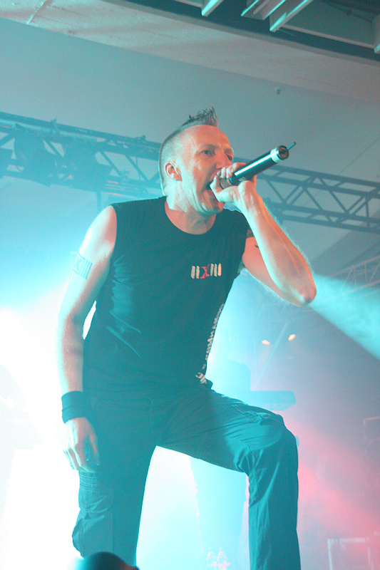 Amphi Festival 2011Samstag mittag, 12 Uhr - es geht los. Und zwar mit [X]-RX. Das auf der Bühne als Duo agierende Projekt des Kölners Pascal Beniesch hat sich schwer technoiden Industrial-Klängen verschrieben und so bezeichnet man den Sound selber als "Industrial Rave". Mit Kunstblut beschmiert und mit feschen Frisuren fegen Pascal und sein Mitstreiter über die Bühne und brüllen ihre Texte ins Publikum, das im Falle der Neonbunten schnell mit der körperlichen Ertüchtigung anfängt. Zwischendurch geht es immer mal wieder an den Techniktisch, um ein bisschen an den Sounds zu drehen. Sieben Songs geben die beiden Jungs zum Besten, das aber ausgerechnet der größte Hit "Die Sexualkiste der Hölle" außen vor bleibt, verwundert doch ein wenig. Solide Eröffnung ohne größeren Überraschungseffekt.