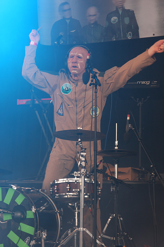 Amphi Festival 2011Den Anfang macht mit SHE'S ALL THAT eine Band, die 2010 ihr Debütalbum veröffentlicht hat, die aber vor allem durch ihre höchst ungewöhnliche Bühnenshow im Gedächtnis bleibt. Denn die Bandmitglieder verstecken sich hinter hautengen Masken, was dem Ganzen eine verstörende Atmosphäre gibt. So springt die Figur am Mikrofon zwar wild in der Gegend herum, sieht aber aus, wie ein uralter Kobold. Der Mund bewegt sich zum Gesang, doch ansonsten ist die Mimik unverändert - klar, ist ja nur eine Maske. Ebenso skuril wirkt der Schlagzeuger, während der Gitarrist sich unter Mütze und Gesichtsmaske versteckt. Musikalisch gibt es einen Mix aus Alternative Rock, Pop und Industrial, dazu ist der Gesang oft mal verzerrt. Mit der Zeit bemerkt man dann auch, dass die Figur, die das Publikum pausenlos antreibt, eine Frau ist. Da es immer noch nieselt, suchen viele Leute Schutz unter den Pilzen, was der Band sicherlich zugute kommt. Insgesamt eine spannende Angelegenheit, die auf jeden Fall viel besser gefällt, als das, was Sängerin Shirin in den 90ern gemacht hat - da war sie nämlich mit der Band NOBLE SAVAGES im Dance-Pop unterwegs.