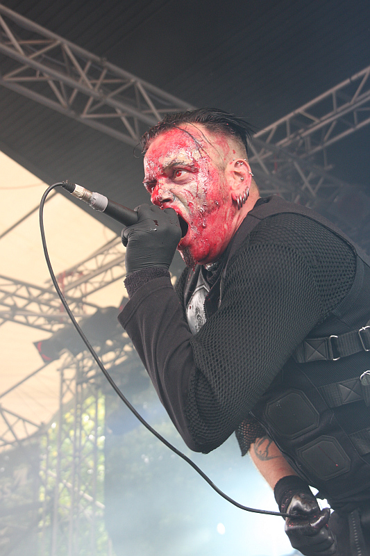 Amphi Festival 2011Die Überraschung ist groß, als Bruno Kramm, der diabolische Clown und musikalische Kopf von DAS ICH die Bühne betritt und verkündet, dass Frontmann Stefan Ackermann noch immer wegen schwerer Krankheit unabkömmlich sei und man die Show deshalb mit besonderen Gästen absolvieren würde. Das war wohl auch schon beim Wave Gotik Treffen an Pfingsten der Fall, was dem Verfasser dieser Zeilen ebensowenig bekannt war, wie einem Großteil des Publikums, das dementspreched Schwierigkeiten hat, stimmungstechnisch auf Temperatur zu kommen. Klar ist auch, dass ein extrem charismatischer Sänger wie Stefan Ackermann nun mal einer ist, eigentlich nicht zu ersetzen ist, trotzdem hat der Auftritt ein besonderes Flair. Als ersten Gast begrüßt Bruno die lettische Sängerin Vic Anselmo, die den DAS ICH-Song "Das dunkle Land" auf ihrem kommenden Album covert. Die Dame besticht vor allem durch ihre charakterstarke Ausstrahlung und hat außerdem eine gute Stimme. Im Laufe der Show kommt sie deshalb auch noch für "Meine Wiege", "Reanimat" und das große Finale auf die Bühne. Zweiter Gastsänger ist Myk Jung von THE FAIR SEX, der sich zwar redlich bemüht, aber einen durchwachsenen Eindruck hinterlässt. Zu oft blickt er auf seine Textblätter, was man ihm zwar nicht vorwerfen sollte, doch wirkt er aufgrund der Tatsache, dass er die Texte nicht komplett auswendig kennt, recht unsicher. Da Bruno aber mitsingt, funktionieren "Kain und Abel", "Kannibale", "Kindgott" und "Gottes Tod" noch ganz gut. Dritter Gast ist Sven Friedrich (DREADFUL SHADOWS, ZERAPHINE, SOLAR FAKE), der erst "Schwarzes Gift" singt und auch bei der Zugabe dabei ist. Die lautet natürlich "Destillat" und als alle drei Gastsänger mit auf der Bühne sind und man auch noch Ansagen für Stefan macht, ist das Finale dann doch noch ein kleiner Gänsehautmoment. An dieser Stelle gute und schnelle Genesung an Stefan Ackermann.