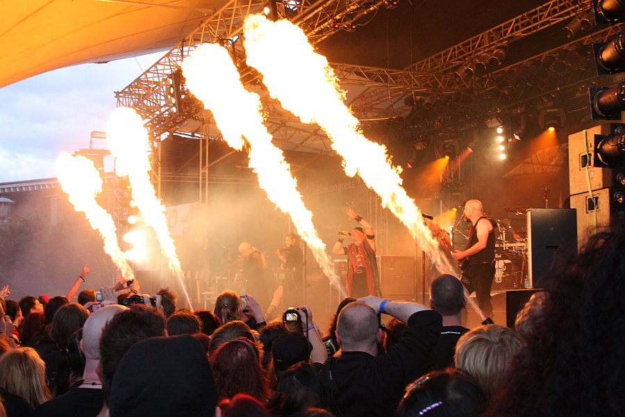Über die Headlinerqualitäten von SUBWAY TO SALLY zu sprechen, hieße Eulen nach Athen tragen. Und so zieht die Band auch an diesem Sonntag abend alle Register und lässt Funken regnen und Feuersäulen aufsteigen, was beim Publikum natürlich jede Menge Anklang findet. Geboten wird darüberhinaus ein klassisches Best Of-Set: "Henkersbraut", "Feuerland" und "Knochenschiff" machen den Anfang, nach "Kleine Schwester" lassen "Die Schlacht" und "Kleid aus Rosen" die Stimmung nochmals ansteigen.Amphi Festival 2011 Ein kurzes Gitarrensolo geht in "Maria" über, das von den Gästen inbrünstig mitgesungen wird. Früh wird auch "Blut, Blut, Räuber saufen Blut" skandiert, was Sänger Eric Fish damit kommentiert, dass man nicht zu viel zwischen den Songs singen sollte, damit noch genug Zeit bleibt, den Song auch wirklich zu spielen. "Meine Seele brennt" und "Judaskuss" sind Anlass für erneute Pyro-Einlagen und der berühmte Schrei wird auch an diesem Abend bei "Das Rästel II" gefordert. Die Band ist perfekt eingespielt und zeigt jede Menge Aktion und Interaktion auf der Bühne - besser kann man es als Headliner kaum machen. "Besser Du rennst" und "Falscher Heiland" folgen, bevor man zum "Veitstanz" aufgefordert wird - das Publikum lässt sich natürlich nicht zweimal bitten. Danach verabschiedet sich die Band kurz, kommt aber für zwei Zugaben auf die Bühne: "Sieben", das von den Fans mit entsprechenden Handzeichen (ausgestreckte Finger an der einen Hand, die Hörner an der anderen) honoriert wird und natürlich das unvermeidliche "Julia und die Räuber" werden zum Abschluss gespielt.