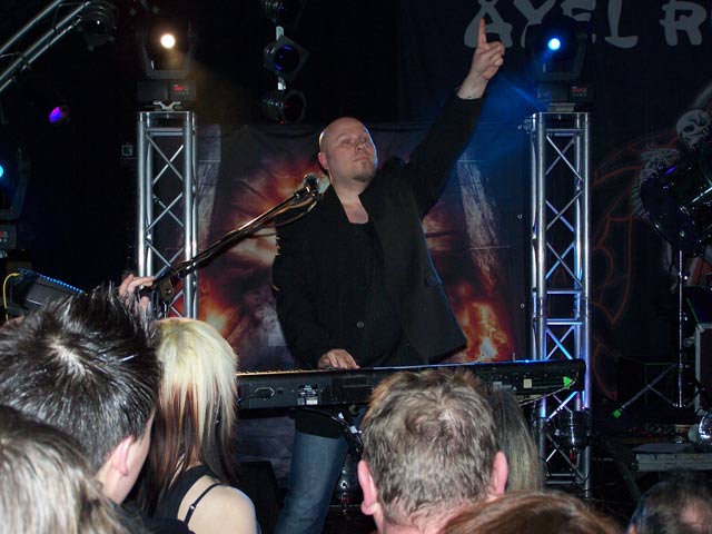 mitreißend und ausgiebig runterzockt und ein Highlight der Show liefert. Selbst Axel kommt dabei mal etwas stärker aus sich raus und betätigt sich zwischenzeitlich als Faust schwingender Motivator. Ansonsten zeigt er sich wie üblich nicht nur recht bewegungsarm, sondern auch gewohnt stumm und zurückhaltend und man hat ja oftmals den Eindruck, ihm sei gerade eine Laus über die Leber gelaufen. Seine Gefühle offenbart er halt lieber mittels seiner weißen Fender, wie etwa verschärft bei "The Temple Of The King", bei dem er mal vollständig seinen Einflüssen frei Lauf lässt.Zwischendurch hatte auch Ferdy Doernberg seinen kurzweiligen Einzelauftritt. Dieser hat sich seit seinen Anfangstagen mit ROUGH SILK längst zu einem äußerst gefragten Keyboarder gemausert, der neben mittlerweile drei Soloalben auch schon auf vielzähligen Veröffentlichungen diverser Kollegen zu hören ist. Als mehrere Barhocker in der Bühnenmitte aufgestellt werden, ist der Tastenmann aber erstmal als Verstärkung der Saitenfraktion gefragt; Mike Terrana schnappt sich unterdessen die Bongos und mit den Akustik-Versionen von "Northern Lights" und "Oceans Of Time" lässt man es erstmal entspannt und einfühlsam angehen. Bevor es mit "Rock The Nation" danach wieder heavy wird, beantwortet ein Fan die Frage von Johnny Gioeli nach besonderen Wünschen lauthals mit der STEELER-Nummer "Money Doesn't Count Tonight", was der Sänger sinngemäß mit "trink mal lieber noch einen" entschärft (vielleicht hat er das Anliegen aber auch wirklich nicht verstanden) - klar aber, dass sich Axel auch hier nicht aus der Reserve locken lässt.