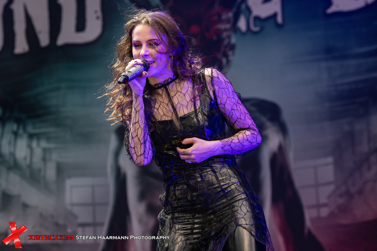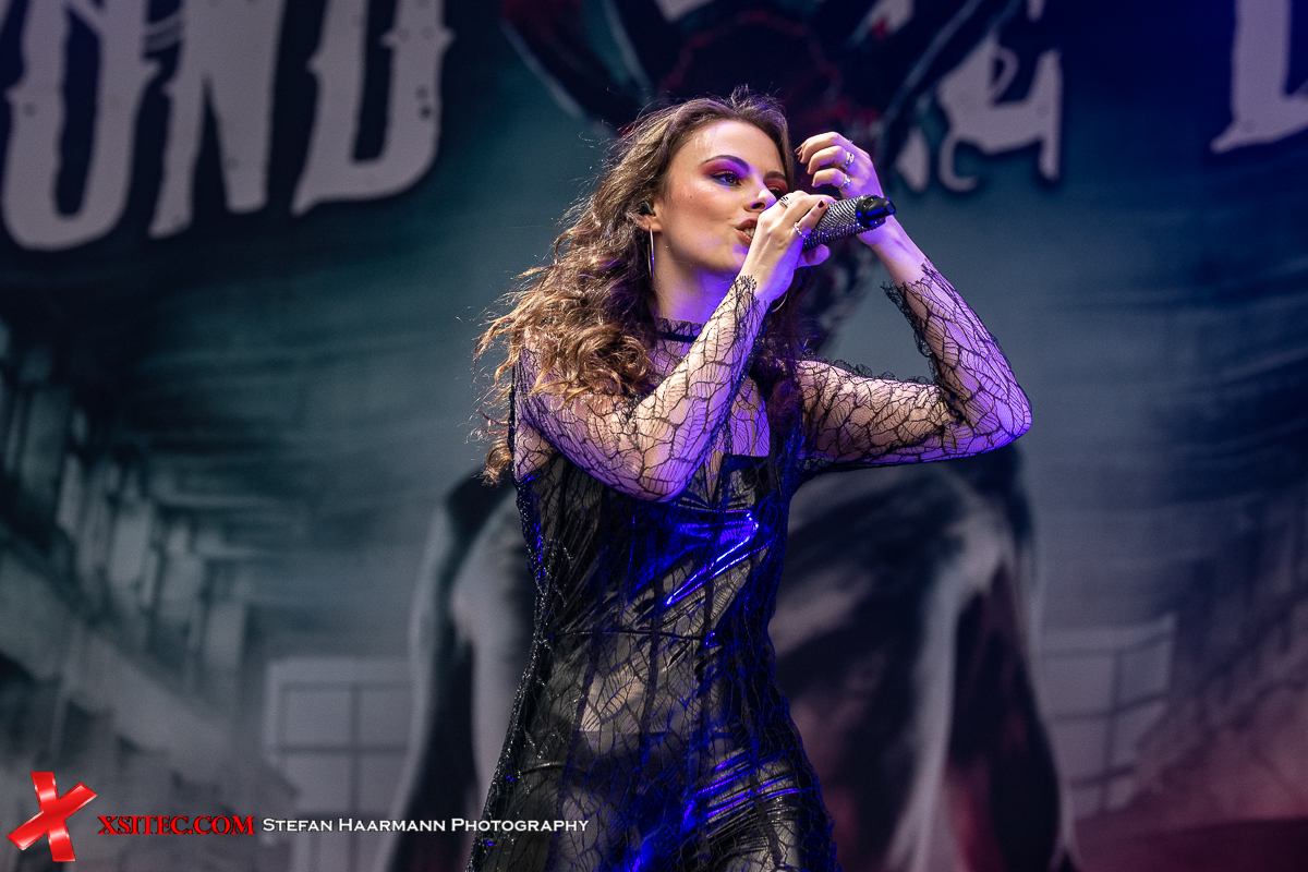 Los geht es mit dem Titel-Track des aktuellen Albums. „HØRIZØNS“ zeigt die Band in prächtiger Laune, Jennifer Haben, die das Publikum im Laufe der Show mit mehreren Kostümwechseln überrascht, beherrscht nicht nur optisch, sondern auch akustisch die Szenerie, auch wenn Chris Hermsdörfer an der Lead-Gitarre auf der neuen Scheibe einige Gesangsparts abdeckt. Ein starker Auftakt in den Abend, der mit „Burning In Flames“ seine Fortsetzung findet und mit „Million Lightyears“ vom 2018er Werk „Heart Of The Hurricane“ schon richtig Alarm im Publikum generiert, zum Leidwesen der Veranstalter auch mittels Autohupen, was mit Rücksicht auf die Anwohner eigentlich nicht gestattet ist.
