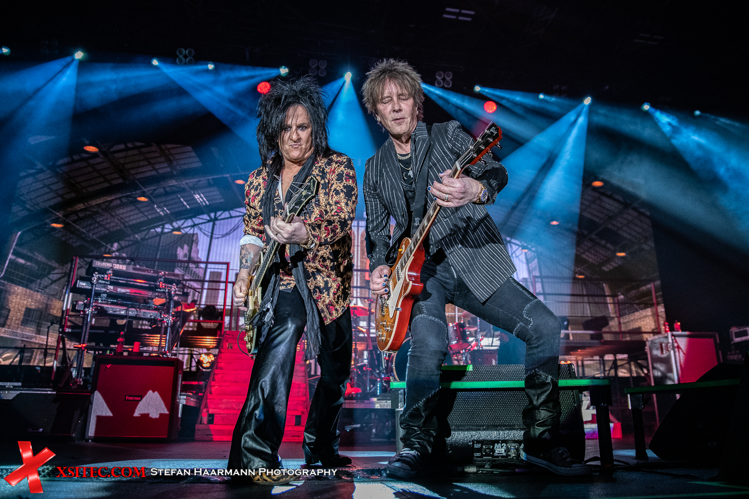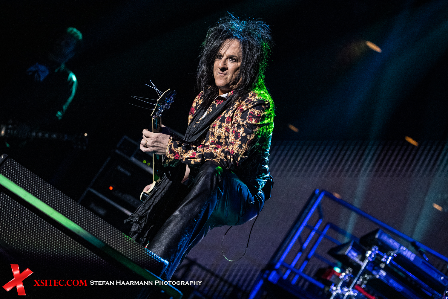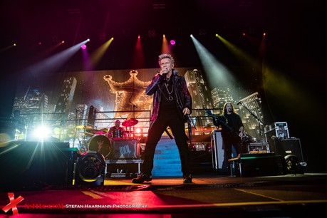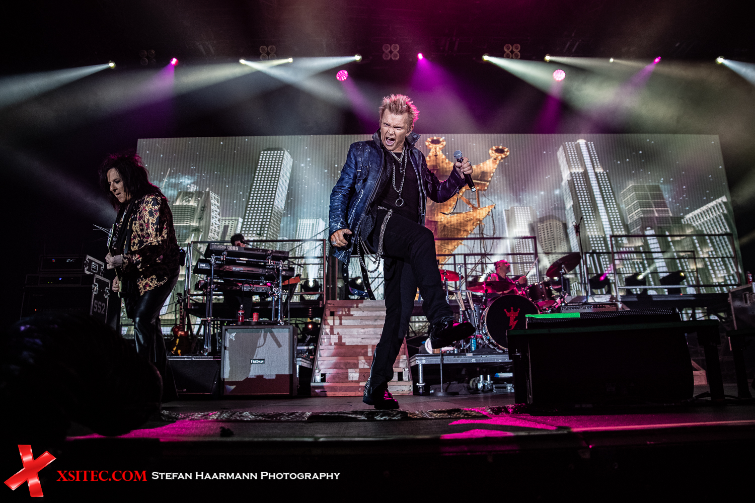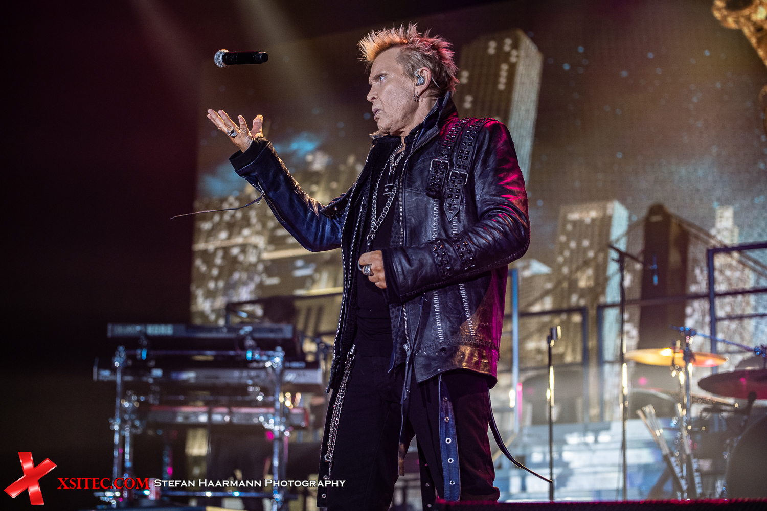 Nachdem die Band aus Nashville die Bühne geräumt hat, geht es nach kurzer Umbaupause weiter mit dem scheinbar ewig jungen BILLY IDOL und dessen Zauberer an der Strom- und Akustik-Gitarre STEVE STEVENS, ohne dessen Mitwirkung ein IDOL-Konzert einfach nicht vorstellbar ist. Zunächst kommen die formidablen Mitstreiter im Halbdunkel auf die Bühne und zelebrieren bereits das Intro des ersten IDOL-Hits des Abends: „Dancing With Myself“ pulsiert durch die Halle und plötzlich ist auch der Hauptakteur Teil des Geschehens. Billy Idol steht auf der hinteren Empore, die perfekt in die Bühnendeko integriert ist und nimmt die Ovationen der Fans in der Halle entgegen. Steve Stevens ist ebenfalls sofort in seinem Element und spielt die Licks und Soli perfekt wie eh und je. „Cradle Of Love“ und das anschließende „Flesh For Fantasy“ werden zudem in Maxi-Versionen dargeboten, die insbesondere von Steve Stevens immer wieder zu kleineren Einlagen genutzt werden. Idol feuert zudem das Publikum zwischendurch immer wieder durch sein langezogenes „DÜÜÜSELDORF, GERMANYYYY“ zusätzlich an.
