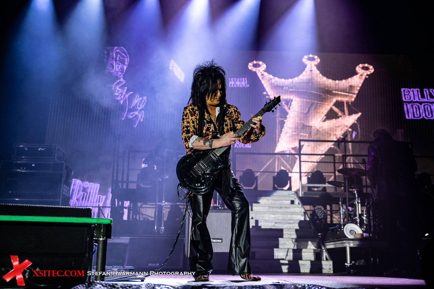 Das stampfende „Mony Mony“ zieht das Tempo in der Folge wieder deutlich an und Billy muss hier im Chorus nicht wirklich selbst singen, diesen Part übernimmt das tolle Düsseldorfer Publikum, das den Punk Rocker ein ums andere Mal (zu recht) hochleben lässt. Nach „Running From The Ghost“ und „One Hundred Punks“, einem alten GENERATION X-Titel, folgt eine grandiose Version des IDOL-Klassikers „Blue Highway“, der zunächst mit Akustik-Part völlig neue Facetten aufzeigt, bevor Steve Stevens dann während des Song an die Stromgitarre zurückwechselt, um den weltbekannten Riff entsprechend zu zelebrieren. Zudem integriert der Virtuose hier noch ganz nebenbei sein „Top Gun Anthem“. Weltklasse.