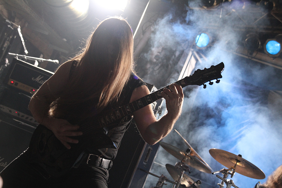 Auch CRADLE OF FILTH sind in diesem Billing nicht unumstritten. Dem trven Schwarzmetaller sind die Briten um Giftzwerg Dani Filth wohl zuviel Kasperletheater und mit Danis extremem Gekreisch muss man eh erst einmal klar kommen. Ziemlich überraschend ist indes, dass er heute Abend selbst die kreischigsten Passagen unerwartet gut meistert, das war in der Vergangenheit nicht immer der Fall und auch auf den letzten Studioalben klang das nicht mehr ganz so derb wie früher. A propos früher, die Teilnahme an der Tour steht für CRADLE OF FILTH, die mit zwei Sessiongitarristen unterwegs sind, im Zeichen des 20-jährigen Jubiläums des Debütalbums "The Principle Of Evil Made Flesh", dementsprechend werden nach dem Opener "Cthulu Dawn" mit "A Dream Of Wolves In The Snow", "Summer Dying Fast" und dem Titeltrack gleich drei Stücke hintereinander daraus dargeboten. Starker Einstieg, dem man mit "Beneath The Howling Stars" einen weiteren alten Klassiker hinterherjagt. Weil Frontmann Filth nicht gerade groß gewachsen ist, steigt er immer wieder auf kleine Emporen, ansonsten hüpft er wie ein Duracell-Häschen auf Speed über die Bühne, was schon recht ulkig wirkt. Der Rest seiner Band übt sich in Posen und Banging, die hübsche Keyboarderin ist in der linken Bühnenecke aber nur zu erahnen. Das Oldschool-Programm wird kurz mit dem neuen "For Your Vulgar Delectation" und dem unnötigen, weil heute zu lahmen "Nymphetamine" unterbrochen, danach darf man sich an "Born In A Burial Gown", dem superben "Cruelty Brought Three Orchids", dem obligatorischen Hit "Her Ghost In The Fog" sowie der Zugabe "Funeral In Carpathia" erfreuen. Starke Setlist also, die ebenso stark dargeboten wird, was für reichlich Applaus im wieder vollen Auditorium sorgt. Dass CRADLE OF FILTH so gut abräumen, darf man also getrost als Überraschung des Abends werten.