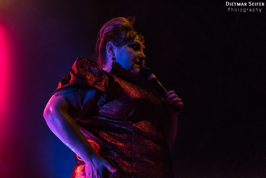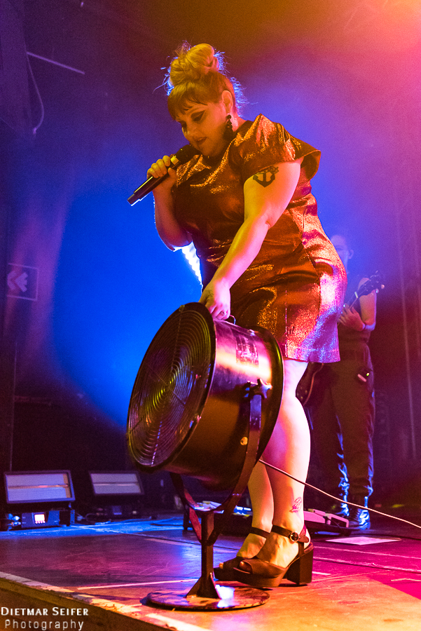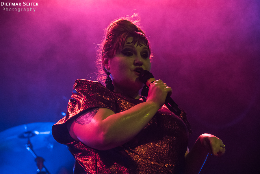Nach einer kurzen Umbaupause war gegen 21:15 Uhr dann die Pop-Ikone an der Reihe. Neben dem Songs des ersten Soloalbums präsentierte sie auchweltbekannte Gossip-Hits. Aufgrund ihrer Körperfülle machen ihr die Temperaturen in der Halle natürlich auch zu schaffen, was sie mit dem Satz „My elbow is schwitzing!“ für alle verständlich zum Ausdruck brachte. Danach trug sie die für sie aufgestellten Ventilatoren an den Bühnenrand und richtete sie auf das Publikum.