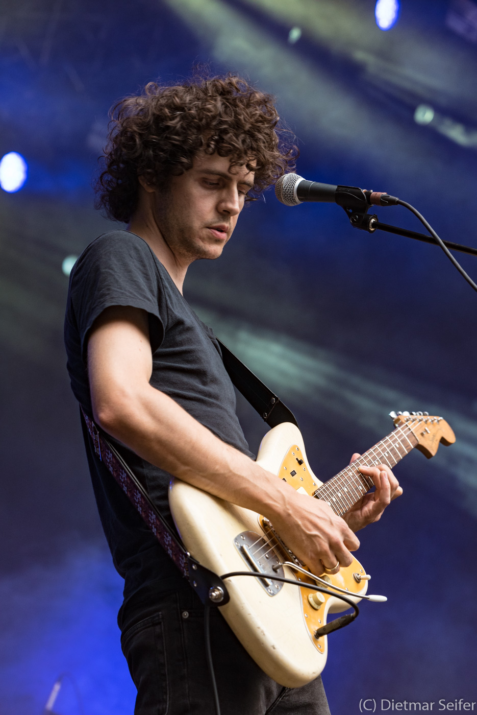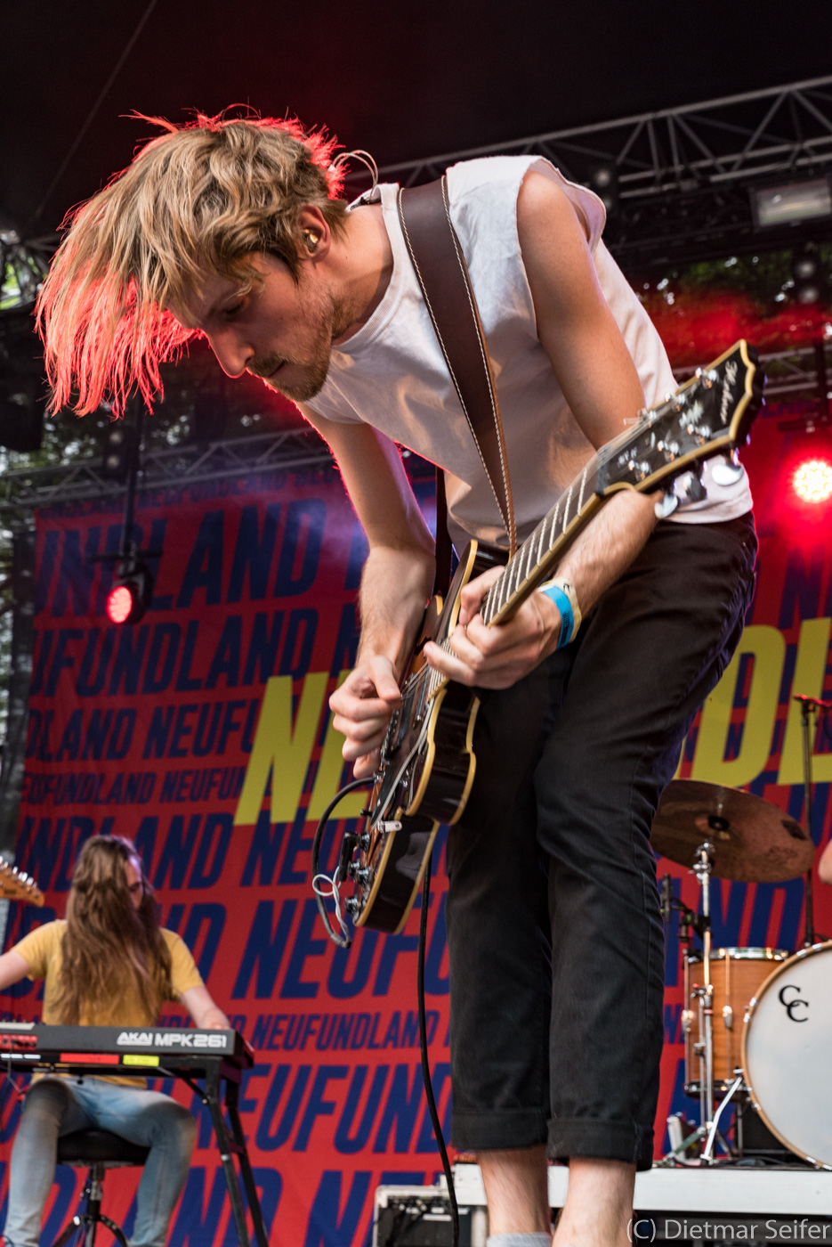 Headliner am Donnerstag, meinem ersten Tag, war sicher die deutsch-britische Popmusikerin Alice Merton, die aktuell mit „No Roots“ unter den ersten 30 in den deutschen TOP 100 Charts vertreten ist. In einem selbstdesignten und hochgeschlitzten roten Kleid, mit einer großen ebenfalls roten Schleife auf dem Rücken und einer vorne angenähten Metallapplikation, die stark an meine frühen Versuche mit Fischer Technik erinnerten, fiel sie neben ihren dunkel gekleideten Bandmitgliedern nicht nur durch Ihre Stimme auf. Nein, sie hat auch, im Gegensatz zu anderen Künstlern, den Soundcheck selber durchgeführt.