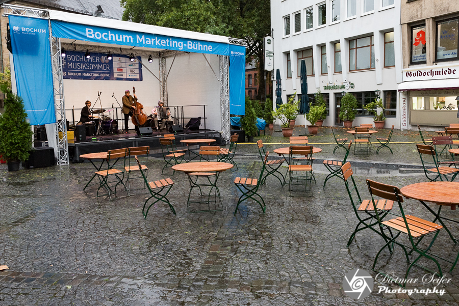 Als ich am Freitag in die Stadt fuhr, war ich zwar dementsprechend gekleidet, aber der dauernde Regen war dennoch ziemlich nervig. Leider sahen das die erwarteten Besucher genauso und blieben einfach weg. Der erste von mir besuchte Gig auf der Bochum Marketing Bühne war festivalüblich etwas spät dran. Der Platz vor der Bühne, welcher mit Tischen und Stühlen eigentlich zum Verweilen einladen sollte, und auch die Treppe hinauf zum Massenberg-Boulevard, auf der sonst Scharen von Menschen sitzen und stehen, waren aber bis auf sage und schreibe vier Besucher menschenleer. Wie ich so oben an der Treppe stand, dachte ich mir: „Ihr seid hier und spielt und ich stehe hier oben rum. Da ich zum Fotografieren hier bin und ihr um Musik zu machen, habt ihr es auch verdient, dass ich auch ein paar Fotos mache.“.