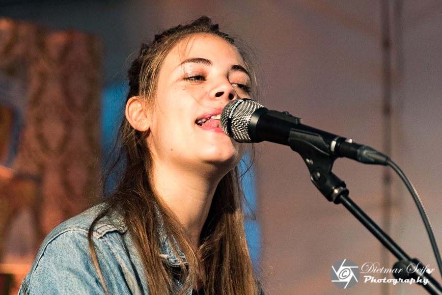 Da ich noch etwas Zeit hatte, bin ich an einer Special-Location vorbeigegangen, der „Wohnzimmerbühne Harmoniestraße“. Dort spielte gerade „Fee.“. Es sind melancholische und eigenwillige, tiefe und schöne Lieder, die die junge Singer-Songwriterin aus Frankfurt am Main schreibt. Nonchalant und direkt erzählt sie in ihren Liedern von der Suche nach dem richtigen Platz im Leben, nach Haltungen zur Welt, von Liebe und Selbstbehauptung. Momentaufnahmen nennt sie ihre Texte. „Ein Foto ist ein Foto. Auch wenn man sich nachher wünscht, man hätte darauf gelächelt.“