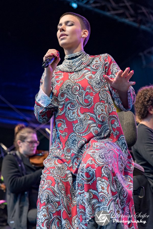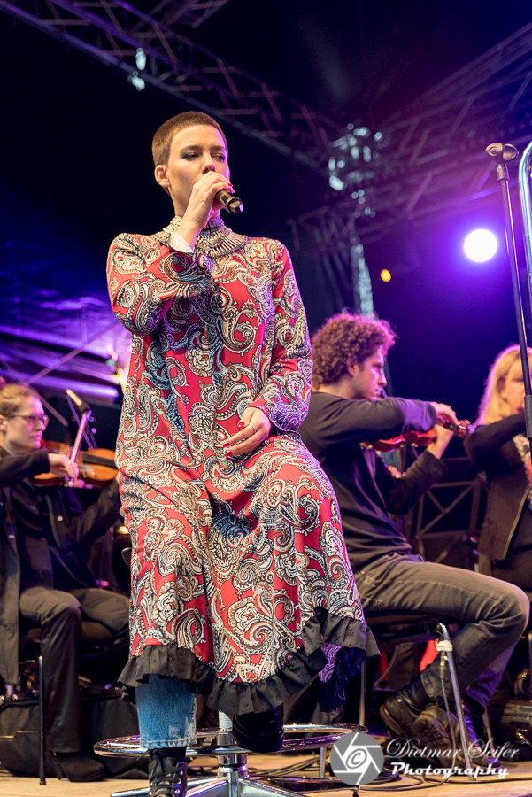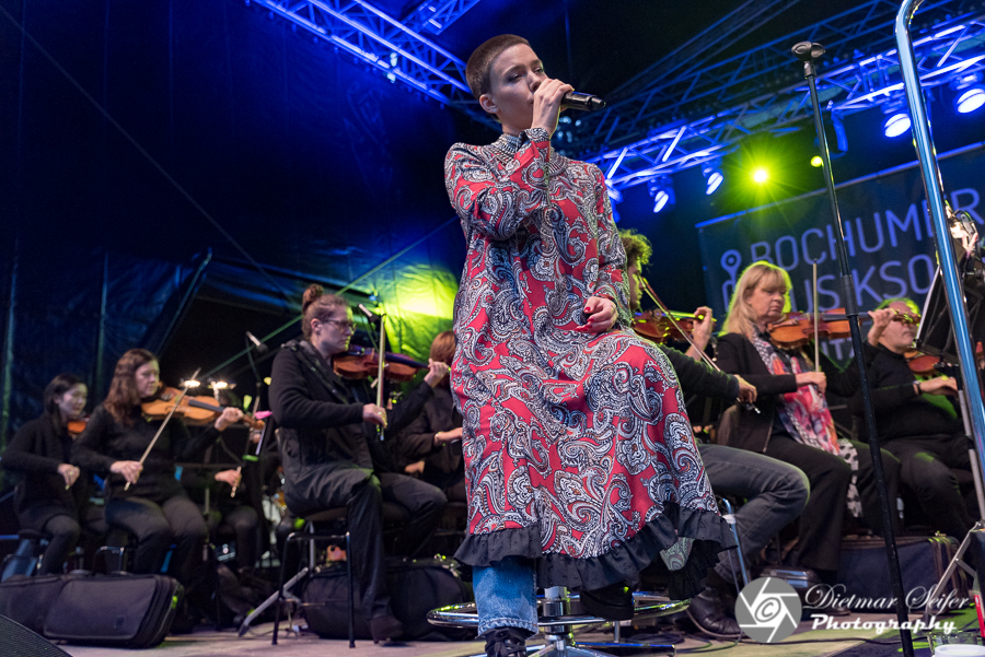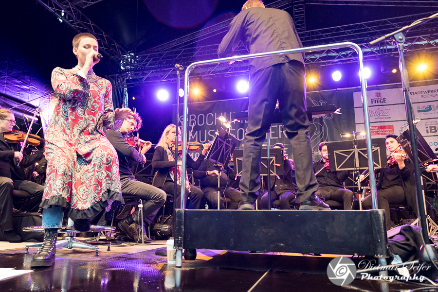 So, jetzt aber zur Moritz Fiege Bühne und zu Frida Gold. Oops, im Gegensatz zu den bisherigen Locations ist der Dr.-Ruer-Platz, auf dem die Bühne aufgebaut ist, sehr gut gefüllt mit interessierten und beschirmten Besuchern jeden Alters. Die Einen kommen wegen Frida Gold und die Anderen wegen den Bochumer Symphonikern. Frida Gold kenne ich bisher nur aus dem Radio und sonstigen Musikkonserven. Die Bochumer Symphoniker hingegen habe ich schon oft live gesehen. Unter der Leitung von Generalmusikdirektor Steven Sloane spielen die Bochumer Symphoniker seit 1994 regelmäßig u.a. im Schauspielhaus Bochum. Am 29.10.2016 haben sie ihr neues Domizil im Anneliese Brost Musikforum bezogen.