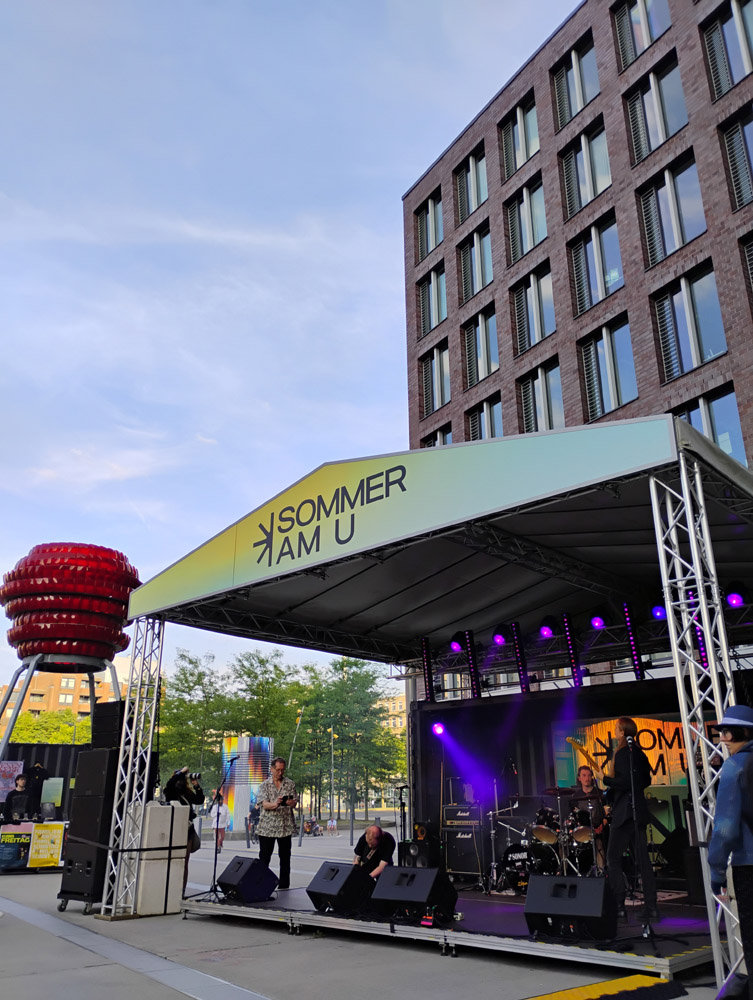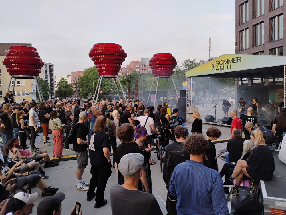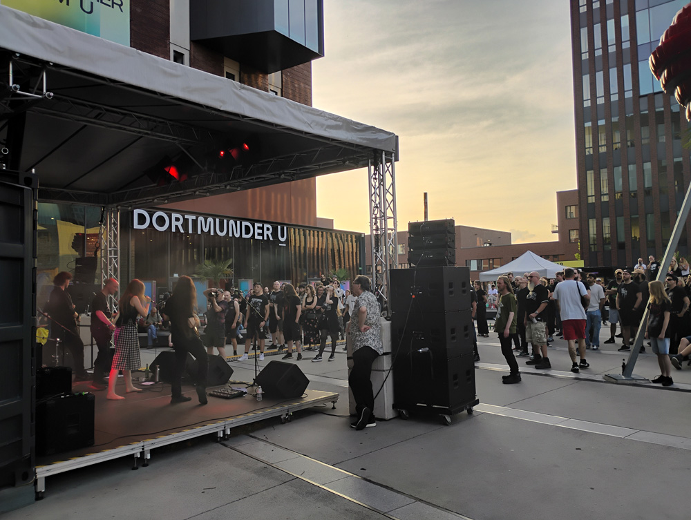 Der Konzertort "umsonst und draußen" unter dem weithin sichtbaren und das Stadtbild prägenden "U" lädt mit Palmen, Liegestühlen, anderen Sitzgelegenheiten und einer Bar zum entspannten Lauschen ein – für (Post) Black Metal also ziemlich ungewöhnlich. Dass die Veranstalterin in ihrer Eröffnungsrede zudem noch auf ein "Awareness Team" hinweist, an das sich die Besuchenden wenden können, wenn sie sich "unwohl" fühlen, verdeutlicht, wie sich rund 30 Jahre nach einigen legendären Black-Metal-Konzerten im Pott manches geändert hat.