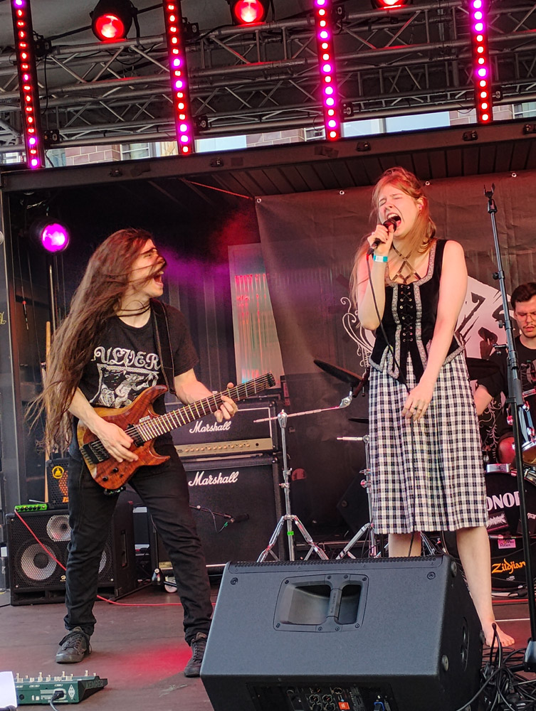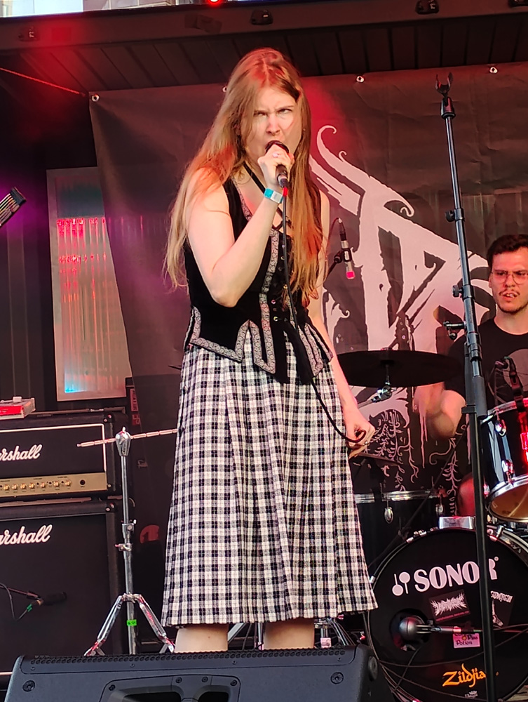 Was es für URISK bedeuten würde, wenn ihre Sängerin Marleen Bügener fortwährend ausfiele, mag man sich nicht ausmalen, denn ihre Performance ragt aus dem im schwarzen bis extremen Metal Üblichen bereits im zweiten Jahr nach Bandgründung deutlich heraus. Das mit ebenso fähigen wie spielfreudigen Musikern zum Live-Quintett aufgerüstete Duo fordert mit seinen progressiven Long Tracks nicht nur die vor der Bühne Anwesenden, sondern auch sich selbst heraus, denn es kann kaum jemand davon ausgehen, dass ihr alles andere als eingängiger, angeschwärzter Prog Metal bei einem in weiten Teilen zwar interessierten, jedoch auch zunächst ahnungslosen Publikum gut ankommt – URISK spielen (im Gegensatz zu den ebenfalls aus Bonn stammenden Steorrah) nun mal keinen Chill-Out-Death-Metal, obwohl der zum aktuellen Setting unterm "U" formidabel passen würde. Statt schmeichelnder Klänge lässt es das Quintett klirren und krachen, streut en passant in "Grip Of Fog" eine Maiden-mäßige Melodie ein, und Marleen faucht und grollt, als gäbe es kein Morgen – und singt so verwegen, dass sich der Schreiberling an Monika Edvardsen (ehemals Atrox) erinnert, die mit ihren ausdrucksstarken und variablen Darbietungen den üblichen Klischees trotzte. Die Zeit verfliegt im Nu, während sich mein Eindruck festigt, dass sich hier eine junge Band warmspielt, die uns in Zukunft noch die eine oder andere Überraschung um die Ohren hauen wird. Im Anschluss an das Konzert bildet sich vor dem kleinen Merch-Tisch eine gar nicht so kleine Schlange, in welcher sich eine vielleicht 13-jährige Teenagerin eingereiht hat, die nach Erwerb des signierten Urisk-Albums vor Freude hüpft: Wer weiß, wozu ein solches Konzerterlebnis den Nachwuchs inspirieren und ermutigen mag?