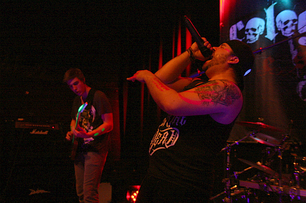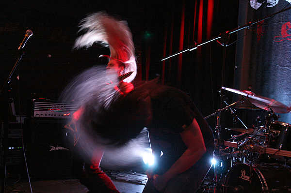 Zurück im Kulturbunker stehen als nächstes ALL WE HATE auf dem Programm. Bei denen spielt mit Pete Rode ein alter Bekannter der Kölner Metalszene Gitarre, vorher war er bei den nicht mehr existenten GUERRILLA tätig und in den 90ern spielte er mit Angela Gossow (heute ARCH ENEMY) bei ASMODINA (die der Verfasser dieser Zeilen auch noch live gesehen hat). Seit 2006 thrasht er also mit ALL WE HATE, die gleich aus mehreren Gründen eine der auffälligsten Bands an diesem Tag sind. Zum Beispiel wegen Gitarrist Dennis Busch, der zwar von der Statur her nicht gerade zu den Größten seines Fachs zählt, aber mit seinen Dreads, die von einem Bandana zusammengehalten werden und seiner Aktivität ziemlich charismatisch ist. ALL WE HATE spielen Thrash Metal der groovigen Art, angetrieben von tightem Riffing und gutem Songwriting, hier ist vor allem das starke "Sort Of Sickness" zu erwähnen. Auch haben ALL WE HATE mit Marc Schwarz einen ziemlich talentieren Shouter in ihren Reihen, der die Songs gekonnt veredelt. Darüber scheint er sich auch genauestens im Klaren zu sein, denn sein Selbstbewusstsein ist offenbar riesig. Das merkt man an Gestik und Mimik und dummerweise auch an seinen Sprüchen. "WIR sind Cologne Metal" wirkt einfach nur arrogant, richtig unsympathisch macht er sich aber mit seinem "Wo bleibt mein Bier? Wasser ist kein Metal. Scheiß Personal hier!"-Gepöbel. Das mag zwar lustig gemeint sein, aber lachen will so recht keiner drüber. Umso unverständlicher, dass ihm ein paar Zuschauer tatsächlich auch noch Bier zur Bühne bringen. Als dann später einige Biergläser vorne stehen, beschwert er sich auch darüber... Warum er im nächsten Leben Schlagersänger werden will, ist dem Berichterstatter wieder entfallen, zur Hälfte des Sets ist die Lust auf blöde Sprüche aber vergangen, so dass man sich auf die Dachterrasse verzieht. So verspielt man Sympathien, die man sich mit der Musik erspielt hatte.