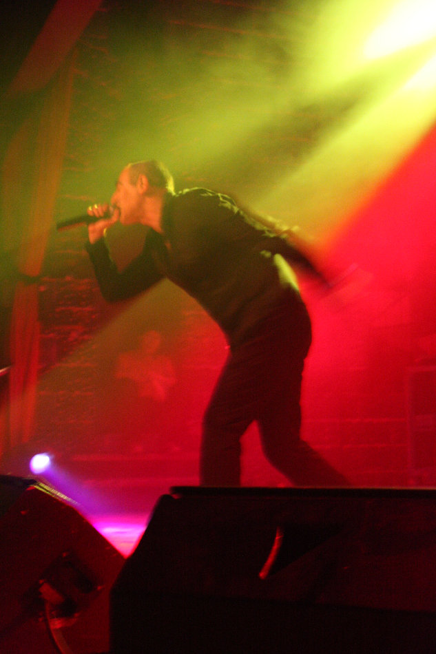 Die bei DAF nochmal aufgeräumter aussah, denn außer einem Schlagzeug und einem CD-Abspielgerät befand sich tatsächlich nichts mehr auf der recht hohen Bühne. Da das Pulp nicht nur von außen, sondern auch von innen wie ein mittelalterliches Schloss aufgemacht ist, wirkt das Gesamtbild seltsam: ein dürrer Gabi Delgado im Vordergrund, hinten nur die Drums und drumherum die altertümliche Optik, dazu erklang minimalistische Elektronik. Vor der Bühne tobte von der ersten Sekunde an der Mob im Pogo, denn DAF eröffneten ihren knapp 70 Minuten langen Set direkt mit ihrem Hit "Verschwende Deine Jugend". "Ich und die Wirklichkeit" folgte und zwei Songs später durften dann auch schon der Mussolini, der Adolf Hitler und der Jesus Christus getanzt werden, was sich das Publikum natürlich nicht zweimal sagen ließ. Nach "Ich will" stellte Gaby dann fest, dass seine Stimme schon so gut wie im Eimer war, was sich im Laufe des Abends natürlich nicht mehr zum Positiven veränderte. Allgemein machte Delgado nicht den fittesten Eindruck, wirkte aber offensichtlich sehr angetan von den Reaktionen aus dem Publikum und gab sich Mühe, Agilität zu zeigen. Homoerotisches bot er mit "Muskeln", bevor er sich erst einmal eine Flasche Wasser über den Kopf gießen musste.