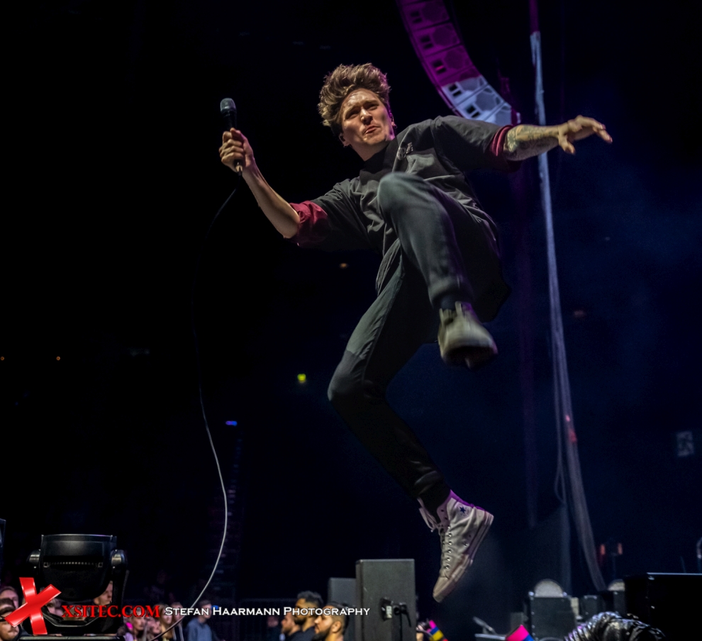 Im Anschluss gibt Sprungwunder Lucas Woodland Kostproben seines Könnens. Neben seinen Gesangsparts gefällt der Frontmann der britischen Post-Hardcore Band HOLDING ABSENCE durch mächtige Sprünge, die ein wenig von der Energie vermitteln, die hier auf die Bühnenbretter gebracht wird. Ein fulminantes Konzert, das allgemeine Zustimmung erfährt.