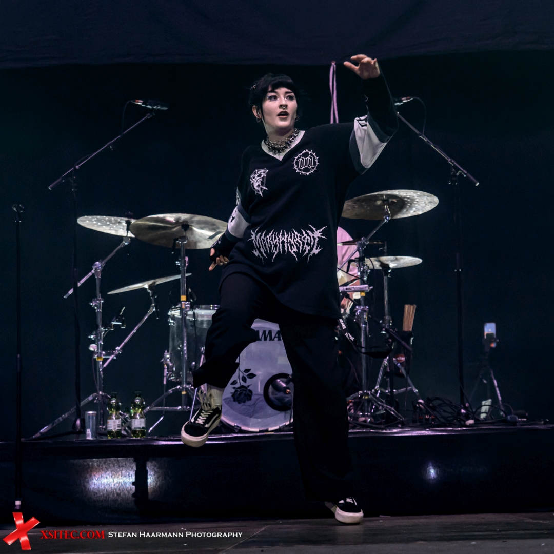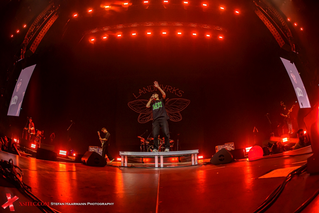 Weiter geht es mit LANDMVRKS, die es sich nicht haben nehmen lassen, eigens aus Marseille nach Oberhausen zu reisen, um hier die Eskalation in neue Sphären zu treiben. Frontmann Florent Salfati ist sichtlich bewegt, als er die Reaktion der Halle nach dem Opener „Creature“ in sich aufsaugt. In der Folge zelebrieren die Jungs aus der französischen Metropole einen tollen Mix verschiedener Stilrichtungen, die von krachendem Metalcore über Hardcore Punk bis hin zu poppig anmutenden Punk Rock reicht. „Suffocate“ startet zunächst als Akustik-Ballade, bevor die Band dann mit Vehemenz in den Song einsteigt. Ein echtes Highlight, das Moderator Pufpaff das Geständnis abringt, die Band vorher nicht gekannt zu haben, nun aber ein neuer Fan zu sein.