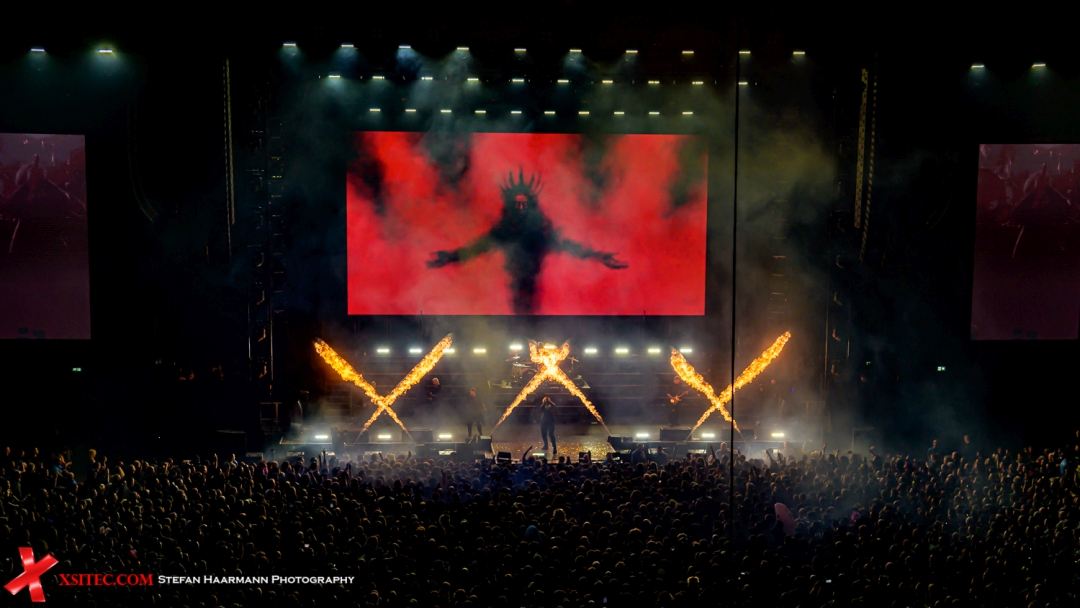 Die beiden Pole-Dance-Stangen werden in der Folge von zwei Tänzerinnen in Beschlag genommen, die während der Show für zusätzliche Hingucker sorgen. Dann aber sind sie da: BAD LOVERZ, quasi direkt vom Sunset-Strip auf die Bühne der Arena – doch halt – mit Dudelsack und Drehleier? Auf der Bühne stehen hier in perfekt-kitschigem Glamrock-Outfit SALTATIO MORTIS, die es sich nicht haben nehmen lassen, das ESCALATION-Fest mit einer Hommage an die große Zeit der Rockmusik zu beehren. Alea glänzt in hautenger Lederhose, die durch quitschpinke Schnüre zusammengehalten wird mit perfekten Posings, die Jon Bon Jovi Anno 1985 nicht besser hätte hinbekommen. Der ROXETTE-Klassiker „The Look“ ist der Auftakt zu einem wilden Ritt zurück in die wohl prägenste Zeit der Musikgeschichte, in der Millionenseller im Wochentakt veröffentlicht wurden. Dass die Halle hier mächtig