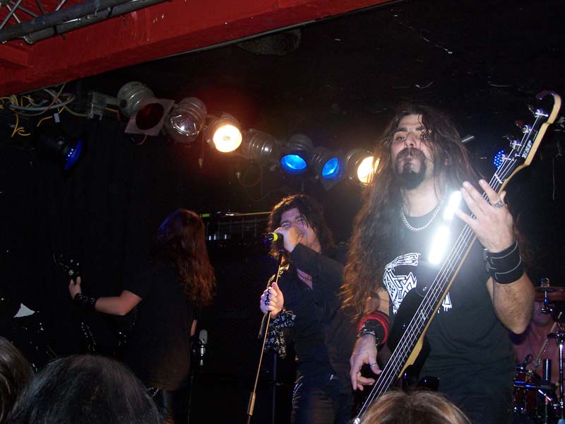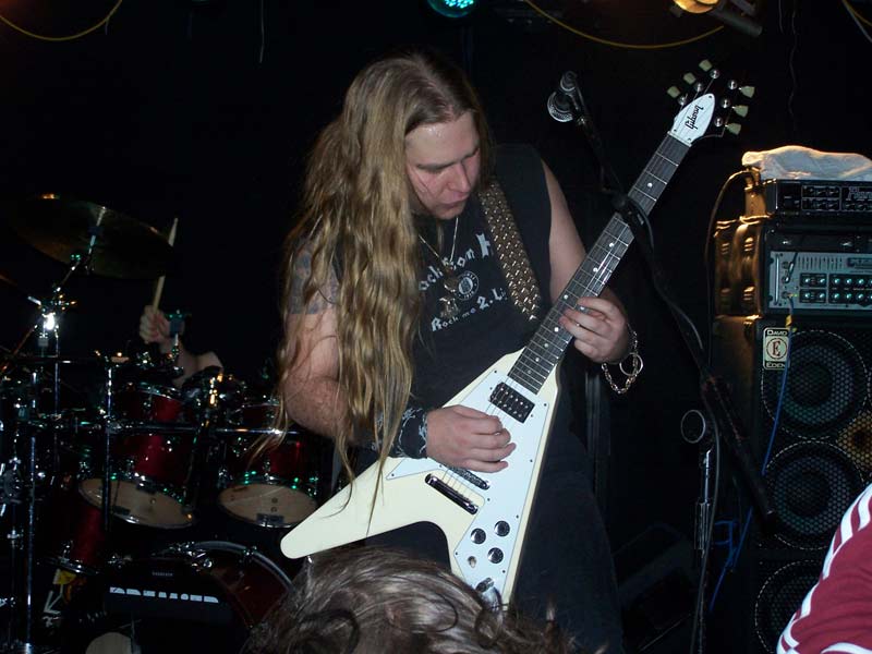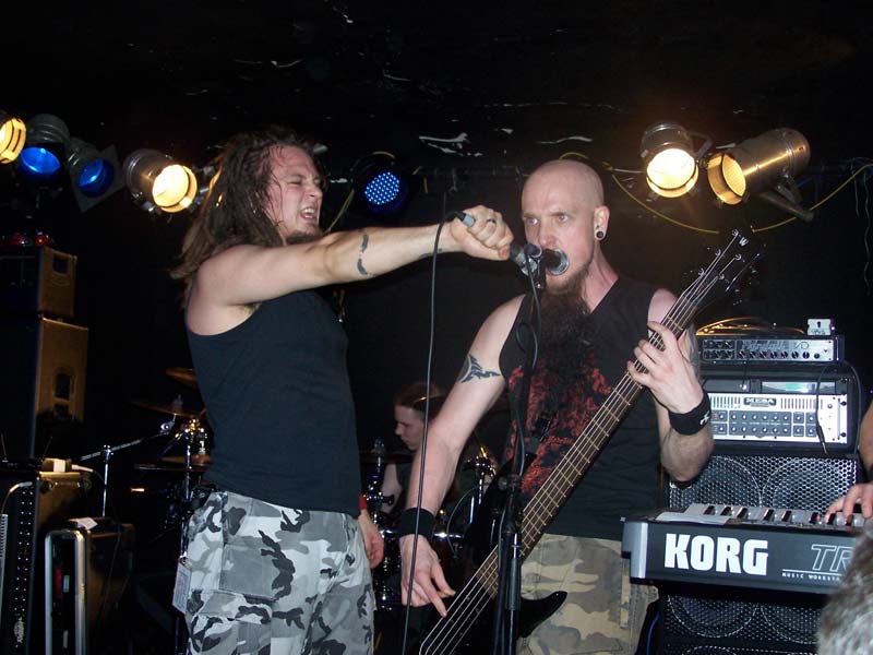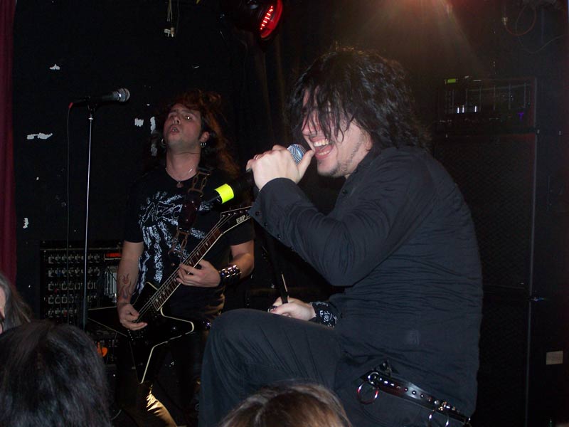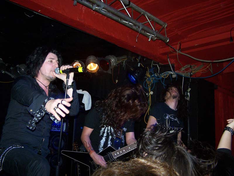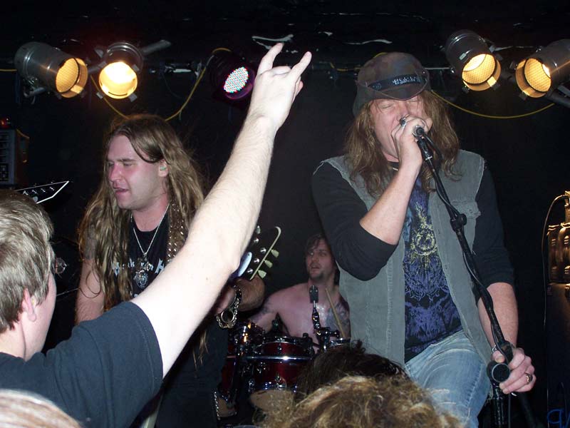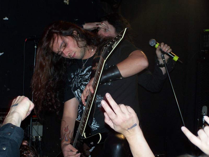 FirewindNach kurzem Intro steigen FIREWIND um 22:40 Uhr mit "Into The Fire", dem Opener der aktuellen Scheibe "The Premonition", in ihr Programm ein. Dies ist für die Griechen der erste Deutschland-Trip als Headliner und obwohl sie in der Heimat und auch anderenorts mittlerweile zumeist wohl größere Aufmerksamkeit für ihren melodischen Power Metal erfahren, zeigen sie sich von der etwas zu mageren Kulisse unbeeindruckt und haben von Beginn an sichtlich Spaß bei ihrer Show. Vor allem der beständig lächelnde Sänger Apollo strahlt unentwegt gute Laune aus, was sich schon bei den treibenden Songs zu Beginn wie "Head Up High", "Kill To Live" und "Allegiance" auch sofort auf die Zuschauerreihen überträgt. Dort finden sich aber halt nicht nur neugierige Besucher, sondern auch merklich eingefleischte Fans, die gekommen sind, um ihre Helden anständig zu feiern. Gerade die ca. 30 Mann in den ersten Reihen gehen sehr gut ab und zeigen sich äußerst textsicher, was Apollo immer wieder mit 'shake hands' belohnt. Dieser entspricht mit seinem offenen Hemd durchaus ein wenig dem Klischee des südländischen Charmeurs, vor allem weiß er aber gesanglich voll zu überzeugen. Mit seiner leicht rauchigen, kraftvoll melodischen Stimme lässt er seine nicht gerade schlechten Vorgänger selbst bei den älteren Songs komplett vergessen. Nicht nur das vom Keyboard eingeleitete "Angels Forgive Me" oder das vom einem kurzweiligen Drum-Solo unterbrochene "Silent Code" kommen nicht zuletzt durch ihn äußerst eindringlich rüber, gerade auch bei gefühlvollen Nummern wie das von ihm als seinen 'favourite song' angekündigte "My Loneliness" zeigt sich seine ganze Klasse.