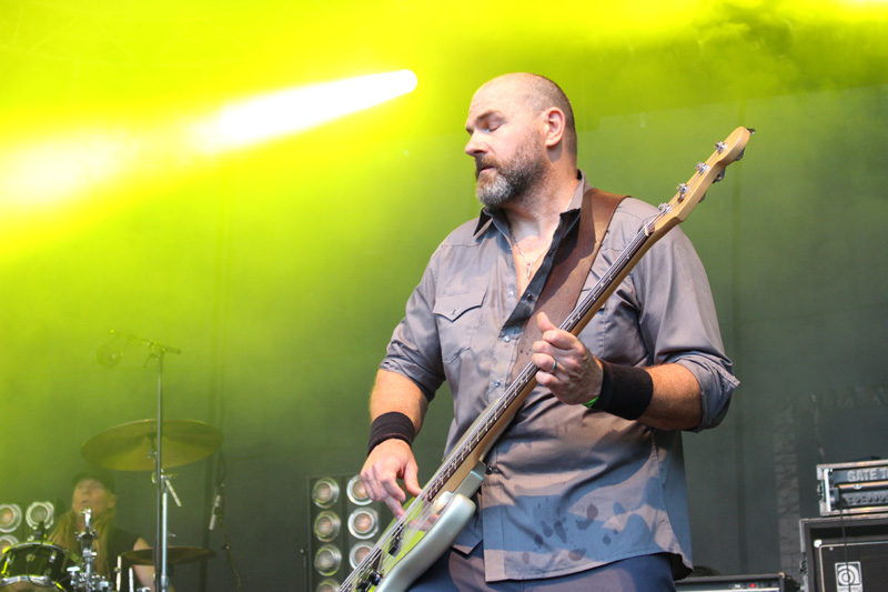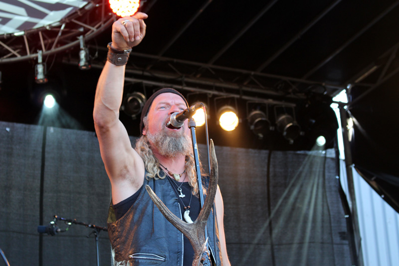 Time for „Black Age Blues“: Dass das kleine, ich schätze mal rund fünfjährige Mädchen, das vor mir von Papas Schultern in den Photograben hin- und zurückwechselt, seine gute Laune beim Auftritt von GOATSNAKE bewahrt, ist eine der bemerkenswerten Geschichten, die das Freak Valley Festival schreibt. Die amerikanische Band zelebriert ihren Auftritt beinahe wie einen Gottesdienst der spirituell eindringlichen Art: Sänger Pete Stahl ist nicht zu halten, sondern wälzt sich auf dem Boden, sucht ein ums andere Mal den direkten Kontakt zum Publikum, windet sich, schreit und singt als wäre der (heilige?) Geist in ihn gefahren. In seiner extrovertierten wie herzlichen Darbietung erinnert er mich an Sir Hannes (Idiots, Phantoms of Future, Honigdieb), der live auch immer alles gibt. Der Stoner Doom des Quartetts steht breitbeinig im ursprünglichen Blues Rock und interpretiert diesen in grenzgängerischer Stumpf-ist-Trumpf-Manier, ohne dass es peinlich oder langweilig wirkt. Intensiv ist die Darbietung, die Gitarrist Greg Anderson u.a. den Bäumen widmet, an deren Anblick sich die ganze Band sichtlich erfreut: „Das sieht so aus wie in unserer Heimat in North Carolina“, zeigt sich auch Bassist Scott Renner gerührt, der selbst wie ein Baum wirkt, der im Zweifelsfall auch einem Orkan die Stirn bietet. Kraftvoll und mit großer Hingabe beschließt das Quartett einen recht kurzen Gig. Zugabe-Rufe werden im weiteren Rund laut.