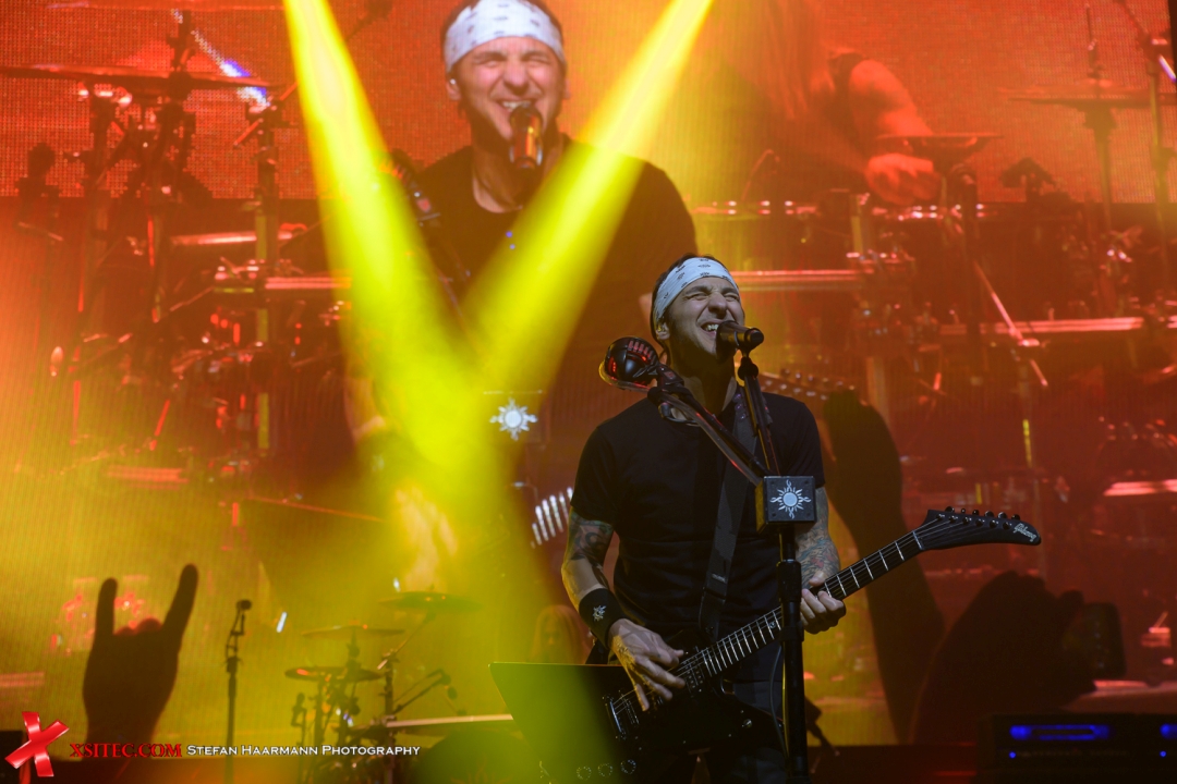 auf die Bühne, die sich in Sachen Spielwitz und Präsenz nicht hinter den langjährigen Bandmitgliedern verstecken muss. Sully Erna trägt wie fast immer sein obligatorisches Stirnband, die LED-Wall im Hintergrund, die für die beiden Supports nicht eingesetzt wurde, erstrahlt nun in voller Schönheit und untermalt die Szenerie mit Einspielern passend zu den Songs.