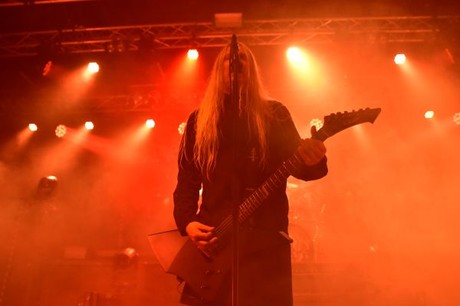 Der überpünktliche Beginn der ersten Vor-Band VREID hat einige Besucher der von Anfang an gut gefüllten Kölner Essigfabrik durchaus überrascht. Dass die Norweger nicht vor leeren Rängen spielten und erste Metalheads bereits heftig die Matte rotieren ließen, stellte unter Beweis: ihr klassisch angehauchter, leicht experimenteller Melodic Black Metal kam bei den Anwesenden durchaus gut an. Zudem erlaubte das sich stetig füllende Haus eine ordentliche Album-Promo. Indes, gleichwohl die neuen Nummern von „The Skies Turn Black“, VREIDs mittlerweile zehntem Output seit Band-Gründung im Jahr 2004, live zum Zuge kamen, so wurden überdies Songs vergangener Tage („Into The Mountains“) performt. Insgesamt ein solider Auftakt.