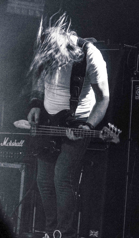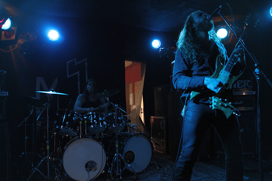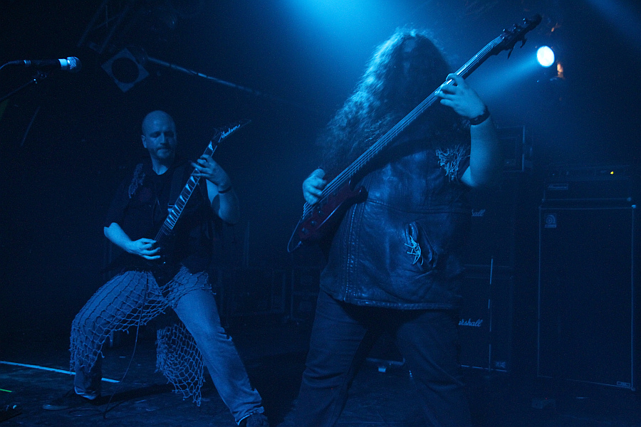 BölzerAn diesem Samstag findet nicht nur das Hell Over Hammaburg statt, sondern auch eine Kundgebung zur Lampedusa-Problematik. Das sorgt für Staus rund um den Hamburger Hauptbahnhof und eine länger als geplant dauernde Anreise. Um 15.45 Uhr, also eine Viertelstunde vor Programmbeginn, steht man vor der Markthalle, die Abfertigung geht zum Glück zügig, so dass man rechtzeitig in der kleinen Marx steht, um BÖLZER zu sehen. Das Duo aus der Schweiz eröffnet das Spektakel in diesem Jahr und ist selber eine spektakuläre Band. Sänger und Gitarrist KzR ist ein echter Hüne mit dickem Rauschebart, hat das Mikrofon in bester Lemmy-Manier so hoch eingestellt, dass er beim Singen darunter hängt und hämmert mit Drummer HzR einen brutalen Mix aus Sludge und Black Metal in die Menge. Mit ihrer Debüt-EP "Aura" haben sich die Schweizer schnell Kultstatus erspielt und werden recht begeistert aufgenommen. In einfarbiges, dunkel eingestelltes Licht gehüllt, entfacht der rohe, derbe Sound eine eindringliche Wirkung und man fühlt sicht von dem mächtigen Inferno direkt zu Anfang ein bisschen überrollt. Insgesamt sieben Songs werden heruntergeholzt, also die drei vom Demo "Roman Acupuncture", die drei EP-Tracks sowie ein bislang unveröffentlichter. Sollte man mal gesehen haben.