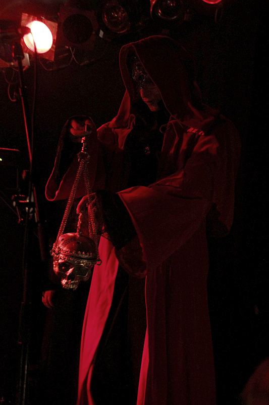 HETROERTZEN sind die vielleicht ungewöhnlichste Band auf dem diesjährigen Billing. Die Black Metaller stammen ursprünglich aus Chile, sind aber nun in Schweden ansässig. Dass ein Teil der Mitglieder vor dem Auftritt mit schickem Anzug durch die Markthalle streift, wirkt ein bisschen skurril, passt aber andererseits auch dazu, dass man viel Wert auf das Drumherum legt. Was jedoch auf der kleinen Bühne im Marx zum Nachteil gerät. Denn wenn man mit fünf Musikern auf der Bühne steht, ein riesiger Gong Platz braucht, ein großes Metallpentagramm untergebracht Hetroertzenwerden und ein Tisch für die rituellen Utensilien und den Kerzenständer bereit stehen muss, wird es verdammt eng. Eigentlich soll die Band auch um 22 Uhr loslegen, doch bis das Intro auch zum richtigen Zeitpunkt gestartet wird (einmal kommt es zu früh), vergehen weitere 20 Minuten. Ob die Verzögerung selbstverursacht ist, sei dahingestellt, im Publikum macht sich jedoch ein bisschen Ungeduld breit. Als es dann endlich losgeht, erscheinen die Musiker in lange Kapuzenkutten gehüllt (darunter eine Gitarristin, die sich unverschämterweise "Åskväder" nennt statt ordnungsgemäß Claudia, Margarete oder Chantalle... - LS) auf der Bühne und Sänger Kæffel sorgt mit mit einem Rauchschwenker in Totenkopfform für sakrale Atmosphäre. In blutrotes Licht getaucht wird orthodoxer Black Metal mit ungewöhnlichem Gesang und rituellen Handlungen dargeboten. Diese Theatralik ist sicher nicht jedermanns Sache, wer dafür jedoch empfänglich ist, hat an der kunstvoll aufgezogenen Show und guten Songs wie "Ardetha", "Blood For The Egregore" und dem abschließenden "The White Priestcraft" seine dunkle Freude. Trotzdem wäre eine größere Bühne für die Band angemessener gewesen. (ASZ)