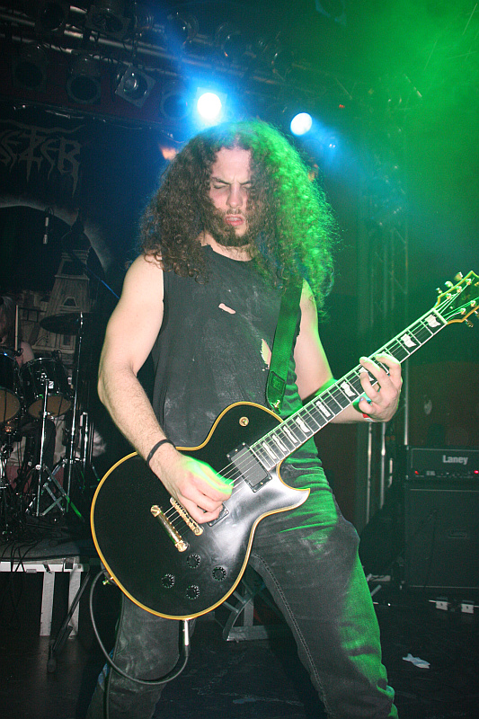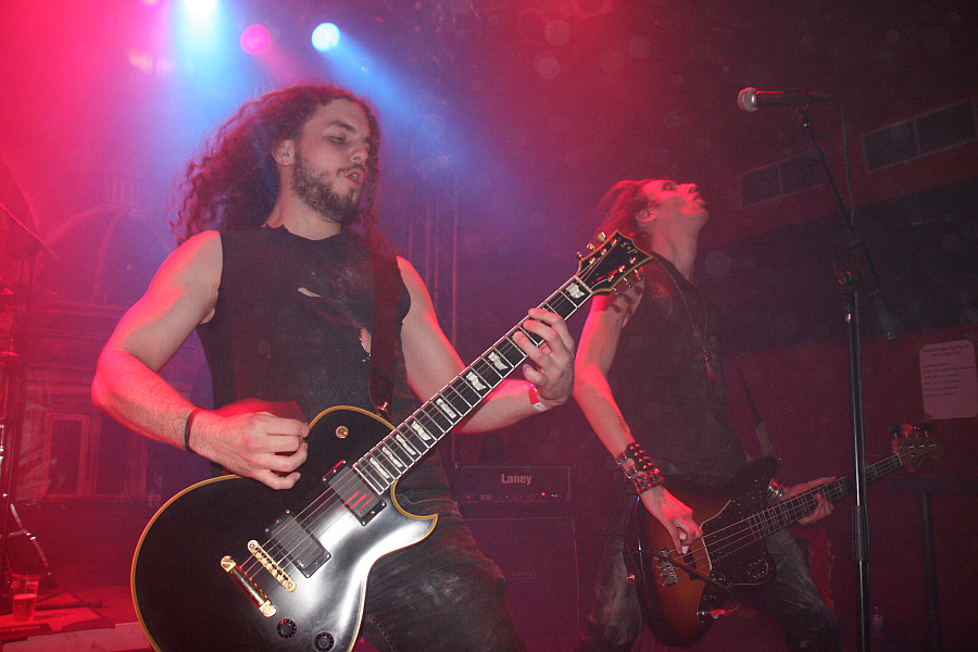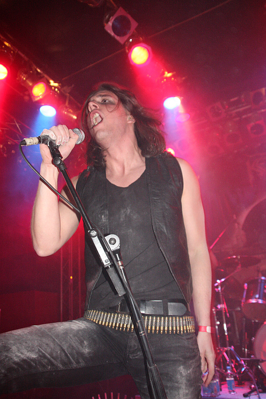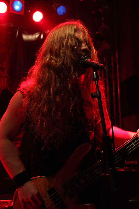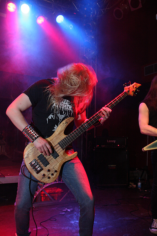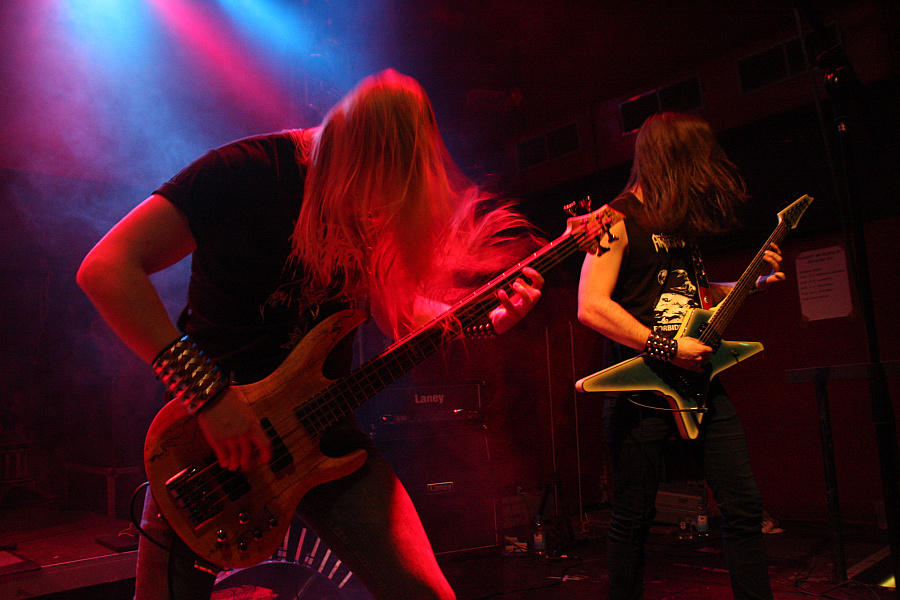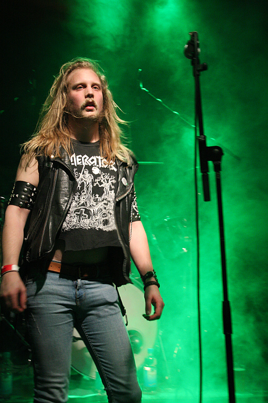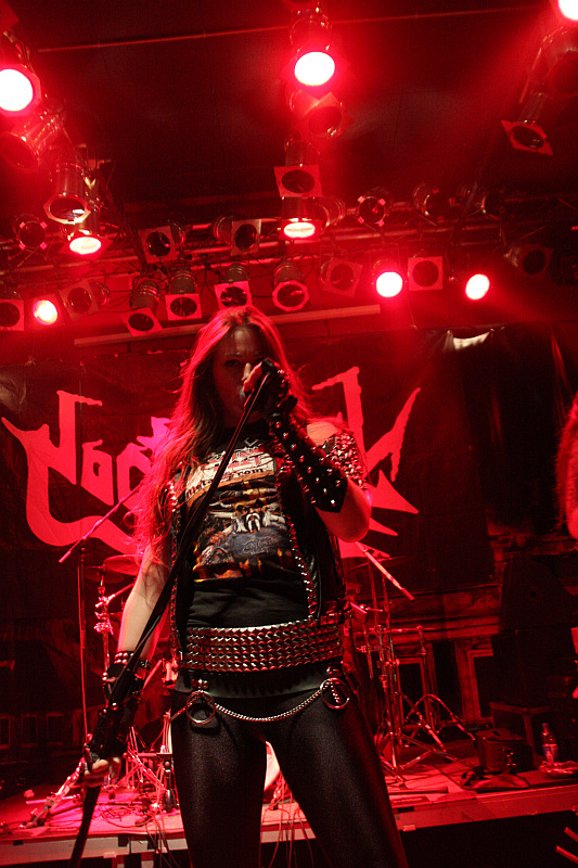 NocturnalZeit für Nieten, Ketten, Kutten und Leder - und für große Posen. Die Black Thrasher NOCTURNAL sind zumindest von der Erscheinung her die derbste Band des Abends und rocken das Turock gewaltig. Der schwarze, rasante Thrash Metal der eher rumpeligen Art kommt beim Publikum bestens an und so sieht man überall fliegende Matten - auf der Bühne und im Publikum. Zwar sind die garstigen Vocals von Frontbiest Tyrannizer, die heute unbestritten der optische Höhepunkt ist, etwas leise abgemischt, das fällt jedoch nicht weiter ins Gewicht. Sie und ihre Mitstreiter bangen, als ginge es um ihr Leben und haben auch sonst jede relevante Metallerpose auf Lager. Das wirkt jedoch zu keiner Sekunde aufgesetzt, sondern überaus authentisch - Stichwort Herzblut. Man merkt NOCTURNAL wirklich an, wieviel Spaß sie an der Sache haben. Angesichts von soviel Enthusiasmus kann man auch darüber hinweg sehen, dass die technischen Fähigkeiten der Band eher limitiert sind und man eigentlich von charmantem Gerumpel sprechen muss. Standesgemäß wird der letzte der zwölf Songs mit "Death to false metal" angekündigt und es erklingt ein rabiates Cover von MANOWARs "Kill With Power".