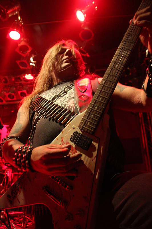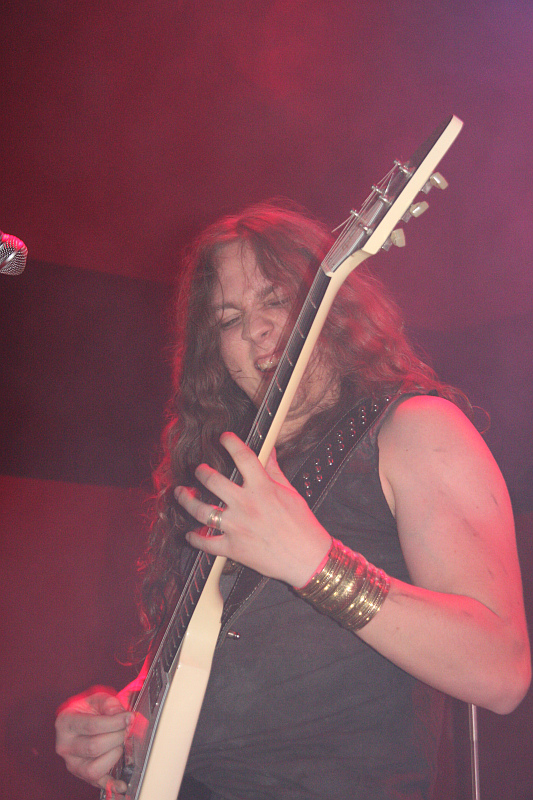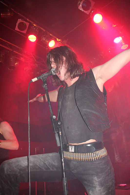 AntichristDie längste Fahrt an diesem Abend haben ANTICHRIST aus Schweden. Die kommen jedoch mit einiger Verspätung in Essen an, weil sie mit dem Zug anreisen (!) und der wegen eines Selbstmörders auf der Strecke nach Düsseldorf umgeleitet wird. Irgendwie schaffen sie es aber trotzdem noch rechtzeitig ins Turock. Beim Anblick der Band fragt man sich jedoch, wie die anderen Mitreisenden im Zug wohl auf die Jungs reagiert haben, denn mit ihren Schnurrbärten, die so gar nicht zu den sonst jungen Gesichtern passen, sehen sie schon arg komisch aus. Auch sonst ist der Look der Band überaus retro geraten und die Vermutung, dass der Zug mit dem sie gekommen sind, nicht direkt aus den 80ern kam, muss erst einmal glaubhaft widerlegt werden. Auf Zeitreise geht man auch musikalisch, der thrashige Speed Metal (oder umgekehrt, das ist Ansichtssache) ist nämlich ebenso herrlich altbacken, wie der Look. Zwar sieht Sänger Steken mit seinem Schlafzimmerblick irgendwie müde aus, von Erschöpfung ist auf der Bühne aber nichts zu merken, denn auch ANTICHRIST schütteln die Haare zu den Songs ihres Debüts "Forbidden World" ohne Unterlass. Coole Band, auch wenn ihre Musik nicht so geil ist, wie Fenriz es uns weismachen will.