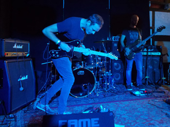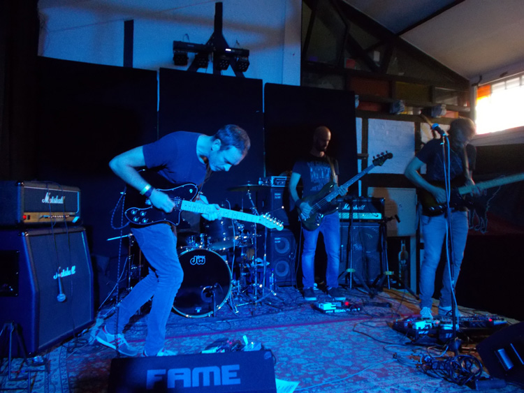 Bei der Stoner-Rock-Band DRIVE BY WIRE aus den Niederlanden steht mit Sängerin Simone Holsbeek die einzige Frau am heutigen Tage auf der Bühne, was die Musikerin selbst verwundert. Mit dem neuen Album "Spellbound" hat das Quartett einige kleine Hits im Gepäck, doch wollen diese nicht so zünden, wie sich das die Band erhofft. Der Bass knarzt ganz wunderbar, die Gitarre ist zu leise, Simone lässt sich trotz zwei überschaubaren Reihen von Zuhörern die gute Laune nicht verderben, und Alwin Wubben nutzt den Raum vor der Bühne für einen Ausflug mit seiner Gitarre. Seine Verwendung einer Kölsch-Flasche zum Sliden auf dem Griffbrett dürfte als eine bemerkenswert sinnvolle Verwendung dieser sonst fragwürdigen Erfindung in die Geschichte der Do(o)mstadt eingehen. Auch bei DRIVE BY WIRE behält die Spielfreude die Oberhand, gleichwohl bereits während des Gigs klar ist: Hier wäre mehr drin gewesen.