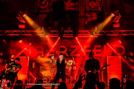 Die Stimmung im Kulttempel ist hervorragend, obgleich die Show deutlich mehr Zuschauer verdient gehabt hätte. Nachdem Heli sich bei den Zuschauern, die sich in die unwirtliche Winternacht aufgemacht haben, um MAERZFELD „Live“ zu erleben, bedankt und abgeklärt hat, wer denn am folgenden Tag arbeiten muss, geht es mit „Ohrblut“, „Ungleich“ und „Menschling“ weiter. Die Fans zeigen sich textsicher und auch „Die Welt Reißt auf“ sorgt für vielstimmigen Background-Gesang vor der Bühne.