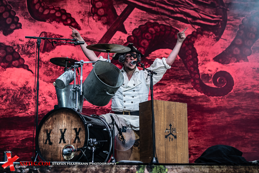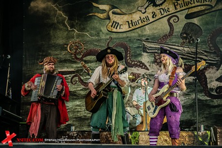 Nach kurzer Umbaupause, in der sich die Fans mit T-Shirts und Kaltgetränken eindecken, geht es mit MR. HURLEY & DIE PULVERAFFEN weiter. Die Party-Piraten spielen eigentlich fast an jedem Sommerwochenende im Rahmen der von Gisbert Hiller organisierten MPS-Tournee und sind daher besonders durch die infolge der COVID-19 Krise abgesagten Events betroffen. Umso frenetischer wird ihr Gang auf die Bühne hier in der Auto Arena gefeiert. In der ersten Reihe parkt ein Piratenbus, dessen Besatzung sich komplett in Piratenmontur geworfen hat, Augenklappen und aufgemalte Zahnlücken wie ihre Idole inklusive.