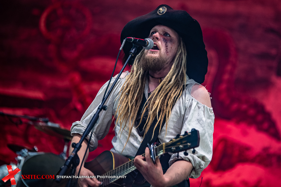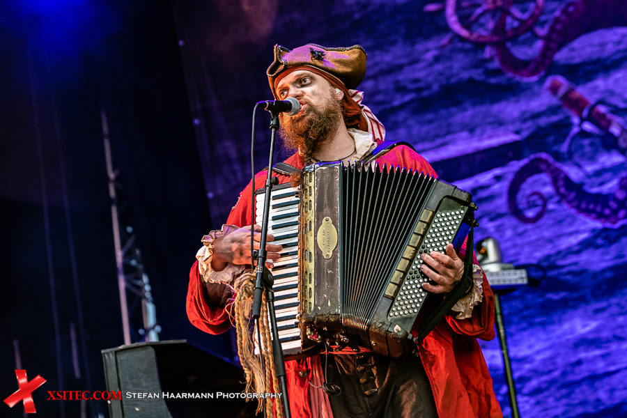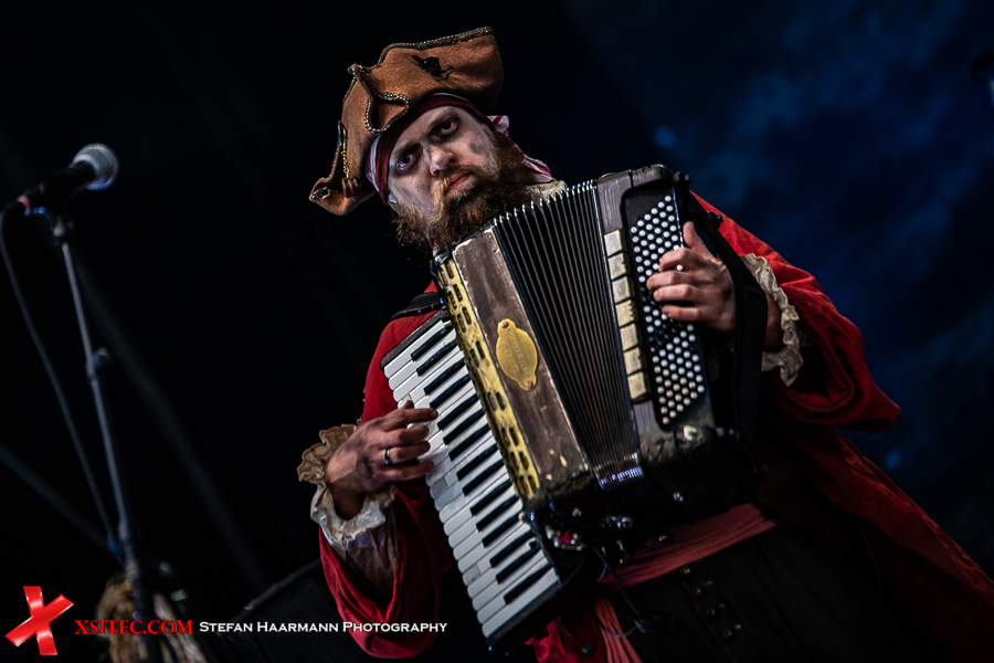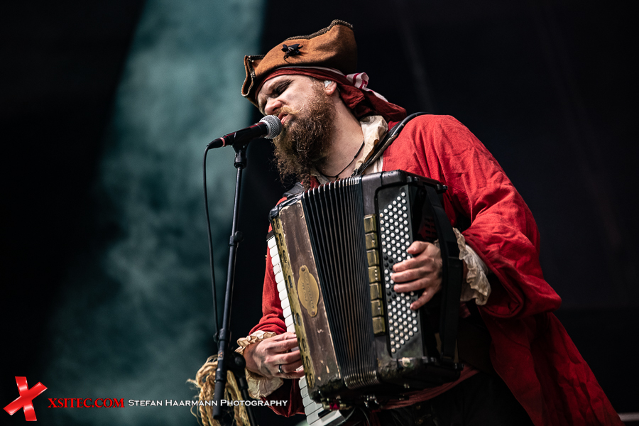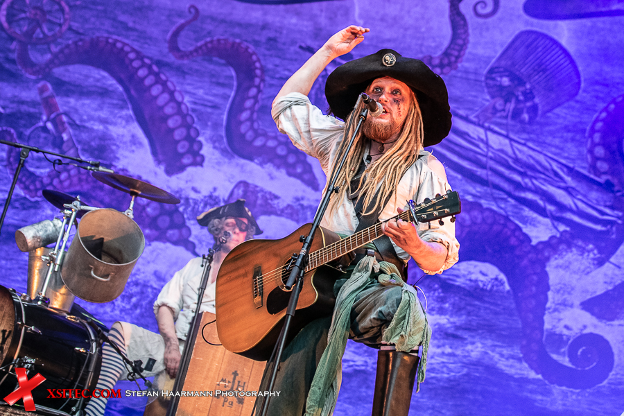 Überhaupt dominieren im Publikum die Piratenkostüme, die sich aufgrund des prächtigen Wetters und der glücklicherweise etwas gelockerten Ausstiegsbedingungen auch auf oder neben ihren Auto aufhalten dürfen, solange sich keine größeren Gruppen bilden. Chefpirat Mr. Hurley geht als erster an Deck, gefolgt von seiner Crew Pegleg Peggy (Bass), Buckteeth Bannock (Akkordeon), sowie dem einäugigen Morgan (Schlagzeug).