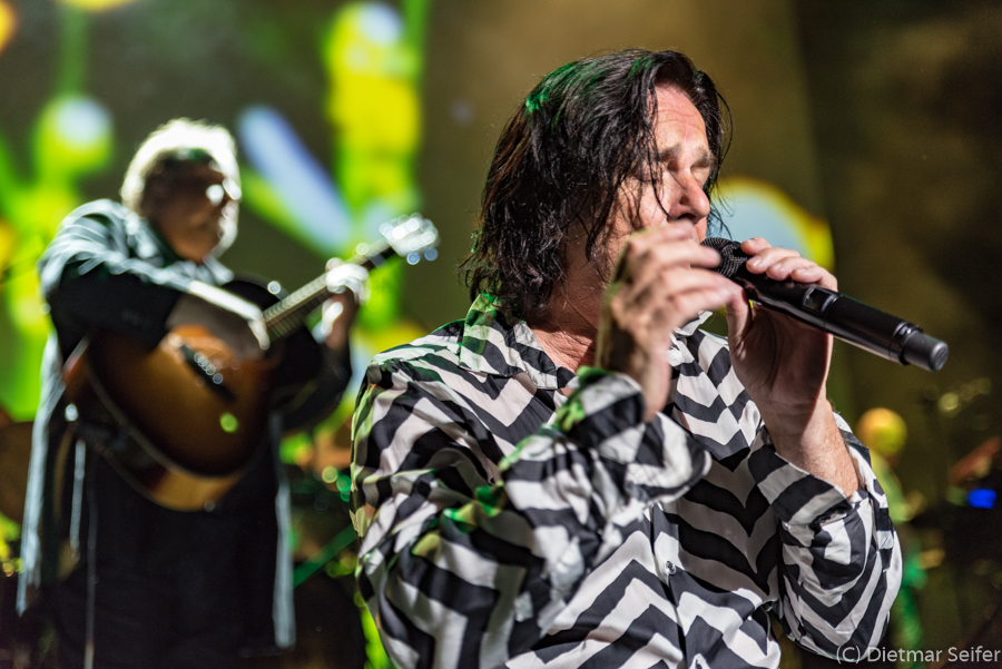 Relativ pünktlich um kurz nach 20:00 Uhr waren die „Altrocker“ dann bereit und starteten gelassen mit „El Dorado (I) Long-Shadowed Sun“ in den Abend. Nach der Nummer, während der Steve Hogarth teilweise am Bühnenrand saß, lag er im Dunklen auf dem Rücken am Bühnenrand, sodass ich mich fragte, ob mit ihm alles ok ist. Doch vermutlich diente dies nur dem Aufbau des Spannungsbogens. Im Verlaufe des Abends war keine Schwäche mehr erkennbar.