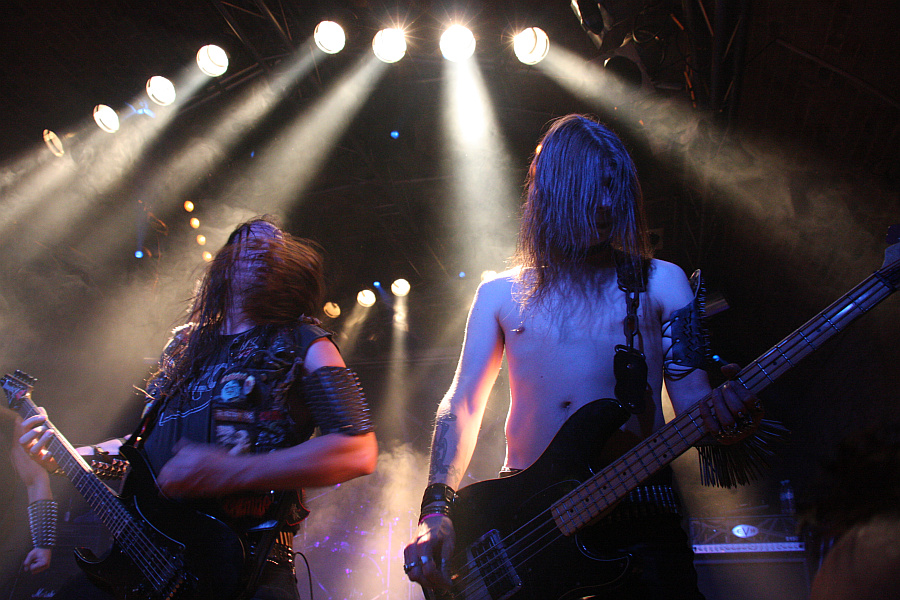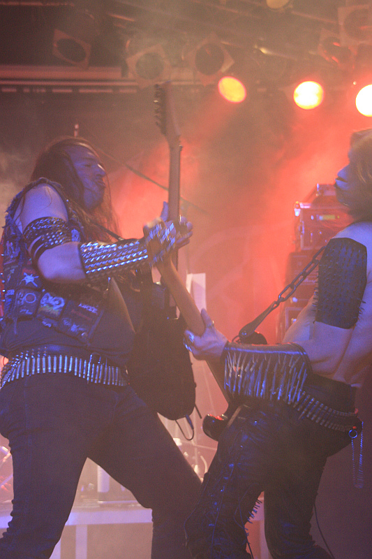 Im runden Gewölbe der Matrix wird es danach noch finsterer, als es eh schon ist. DESASTER entern in echtmetallischer Nieten- und Nägel-Montur und im Falle von Basser Odin auch mit Corpsepaint im Gesicht die Bühne, um dem Publikum eine Ladung angeschwärzten Thrash Metals um die Ohren zu hauen, die sich gewaschen hat. Mit Leidenschaft und Hingabe zelebriert das Quartett seinen finsteren, authentischen Sound und erntet völlig zurecht die bisher besten Reaktionen des Publikums. Besonders die Ausstrahlung von Sänger Sataniac, der seine Texte mit grimmigen Blick bellt, sorgt für boshafte Atmosphäre, aber auch Odin und Gitarrist Infernal sorgen mit sehenswertem Stageacting für das Gelingen der Show. Einziger Wermutstropfen aus Sicht des Rezensenten: da in Sachen DESASTER noch eine dringend zu stopfende Bildungslücke vorhanden ist, wird von den gespielten Songs lediglich "Teutonic Steel" erkannt. Trotzdem eine geile Show.