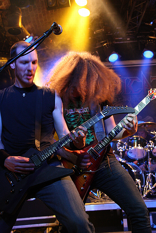 Die Matrix ist in Sachen Sound bekanntlich nicht gerade das Paradies für Akustikgourmets und auch an diesem Abend wird das Problem bei fast allen Bands mit extrem hoher Lautstärke so gut es eben geht kaschiert. So auch bei FORBIDDEN, deren erste Songs sind im Soundbrei kaum zu erkennen, erst ab "Twisted Into Form" an Position vier wird es langsam besser. Zuvor wird die Band von den Fans, die inzwischen gut die Hälfte der Halle füllen, euphorisch begrüsst. Mitgebracht haben die Bay Area Thrasher mit Gene Hoglan an den Drums einen besonders hochkarätigen Gast, der ein sattes Rhythmusfundament legt. Die beiden Gitarristen Craig Locicero und Steve Smyth zocken die Songs mit beeindruckender Tightness, lediglich der schwergewichtige Frontmann Russ Anderson hat nicht seinen allerbesten Tag erwischt und wirkt manchmal etwas aus der Puste. Vom aktuellen Album "Omega Wave" werden "Forsaken At The Gates", "Overthrow" "Dragging My Casket" und der Titeltrack en bloc geboten, ansonsten reiht sich ein Bandklassiker an den anderen. "March Into Fire" eröffnet den bunten Reigen, "Step By Step" und "Off The Edge" folgen. "R.I.P." wird dem kürzlich von uns gegangenen Matt LaPorte gewidmet. Zum Ende des Gigs hat sich das Publikum dann zwar schon deutlich gelichtet (was vermutlich auch an der Happy Hour mit preiswertem Fassbier bis 19 Uhr liegt), doch mit "Infinite", "Through Eyes Of Glass" und "Chalice Of Blood" setzen FORBIDDEN dem guten Auftritt das Krönchen auf.Es bleibt abzuwarten, ob es noch einen dritten Teil von Metropole Ruhr geben wird, denn die Probleme, die man bei der diesjährigen Organisation hatte, werden angesichts der Tatsache, dass man selbst die Matrix nur zur Hälfte füllen kann, sicher nicht weniger werden. Wäre schade um die schöne Idee.