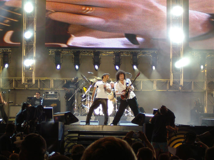 Die Stimmung ist etwas gedämpft, als Katie Melua auftritt. Die Britin präsentiert einen gefälligen Akustik-Pop-Folk, ein bißchen nachdenklich, ein wenig melancholisch. Die Zuschauer fressen ihr aus der Hand. Nächster Überraschungsgast ist Will Smith, der nun den weiteren Abend moderiert. Die Stimmung steigt senkrecht an. Die Menge rastet aus, als Nelson Mandela die Bühne betritt. Der 87jährige wird wie ein Held verehrt. Körperlich sichtlich angeschlagen, aber geistig fit hält er seine Rede. Nach weiteren Auftritten von Annie Lennox und einigen südafrikanischen Bands wie Black Sun ist es endlich soweit: Knapp neunzehn Jahre nach ihrer letzten Tour beginnt für Queen die erste neue Welttournee in Südafrika. In den 80ern ist die Rock Legende leider etwas in zu sehr in Pop-Musik Regionen abgedriftet, in den 70ern haben die vier Ausnahmemusiker aber ein geniales Rock/Prog/Metal-Mix Album nach dem anderen abgeliefert. Nachdem es Ende der 80er, Anfang der 90er musikalisch wieder stark bergauf ging, ist mit Freddie Mercury im Jahre 1991 einer der besten Sänger aller Zeiten gestorben. Nach dem posthum veröffentlichten „Made in Heaven“ war ab 1994 Funkstille in Sachen Queen. Die undankbare Aufgabe, in Freddie Mercurys übergroße Fußstapfen zu treten, übernimmt ex-Free Sänger Paul Rodgers. Am Bass fehlt leider John Deacon, der seit 1991 praktisch nicht mehr in der Öffentlichkeit gesehen wurde. Dennoch reichen Brian May und Roger Taylor aus, um so etwas wie Queen-Atmosphäre aufkommen zu lassen - die beiden haben den Sound von Queen, abgesehen vom Gesang, ja auch überwiegend geprägt.