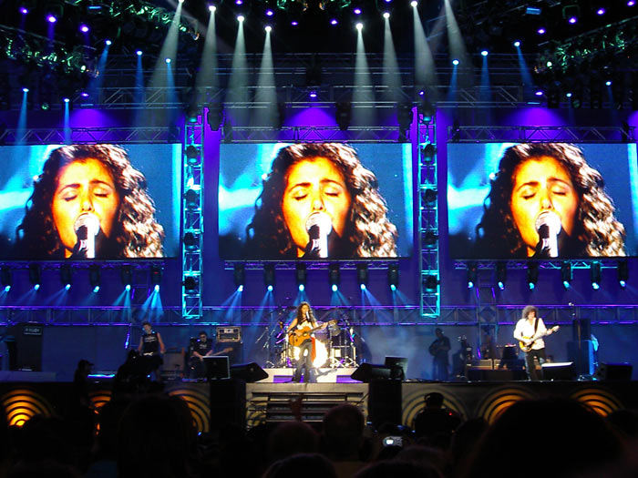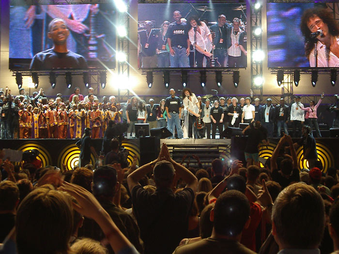 Es wird dunkel, Hubschrauber kreisen über dem Festival, ab jetzt wird auch für’s Fernsehen übertragen. Eine nervige Moderatorin faselt dummes Zeug. Annie Lennox betritt die Bühne und hält eine leidenschaftliche Rede gegen HIV und die Art, wie in Südafrika mit der Krankheit umgegangen wird. 20% (kein Tippfehler) der Bevölkerung sind HIV positiv, zehn bis zwölf Millionen weitere Menschen sind HIV positiv und wissen es noch nicht. Sie spricht von einer Epidemie, die mittlerweile zu einem wahren Genozid heranwächst und die Politiker des Landes würden nichts bzw. viel zu wenig tun.