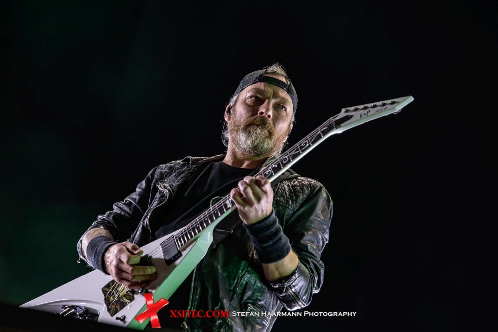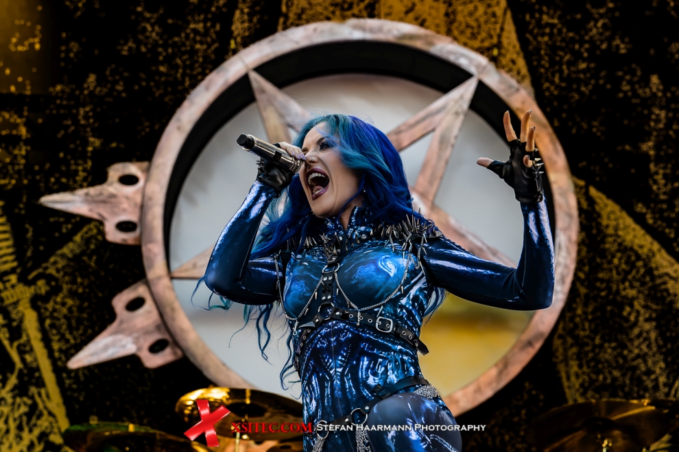 Nach dieser Überdosis Testosteron wirkt der Kontrast, den Alissa White-Gluz mit ARCH ENEMY setzt, geradezu surreal, zumal die Frontlady der schwedischen Erzfeinde alles andere als Kuschelrock zu bieten hat. Neben den virtuosen Gitarrenparts, die Michael Amott und Jeff Loomis ins Scheinwerferlicht rücken, dominiert Alissa die Szenerie mit gutturalem Gesang, der nicht ansatzweise hinter der zierlichen Schönheit zu vermuten wäre. Das Infield vor der MANDORA ist rappel voll, aus allen Richtungen strömen weitere Fans hinzu, die sich diese Sternstunde nicht entgehen lassen wollen. Neu ist das auf dem Kopf stehende Pentagramm über dem Schlagzeug, dass als Eyecatcher seinen Zweck erfüllt und einen perfekten Hintergrund abgibt. Kurz nach Veröffentlichung einer Preview kam dann eine E-Mail des ARCH ENEMY Managements mit der Bitte, das folgende Foto verwenden zu dürfen. Da fühlt man sich dann doch geehrt.