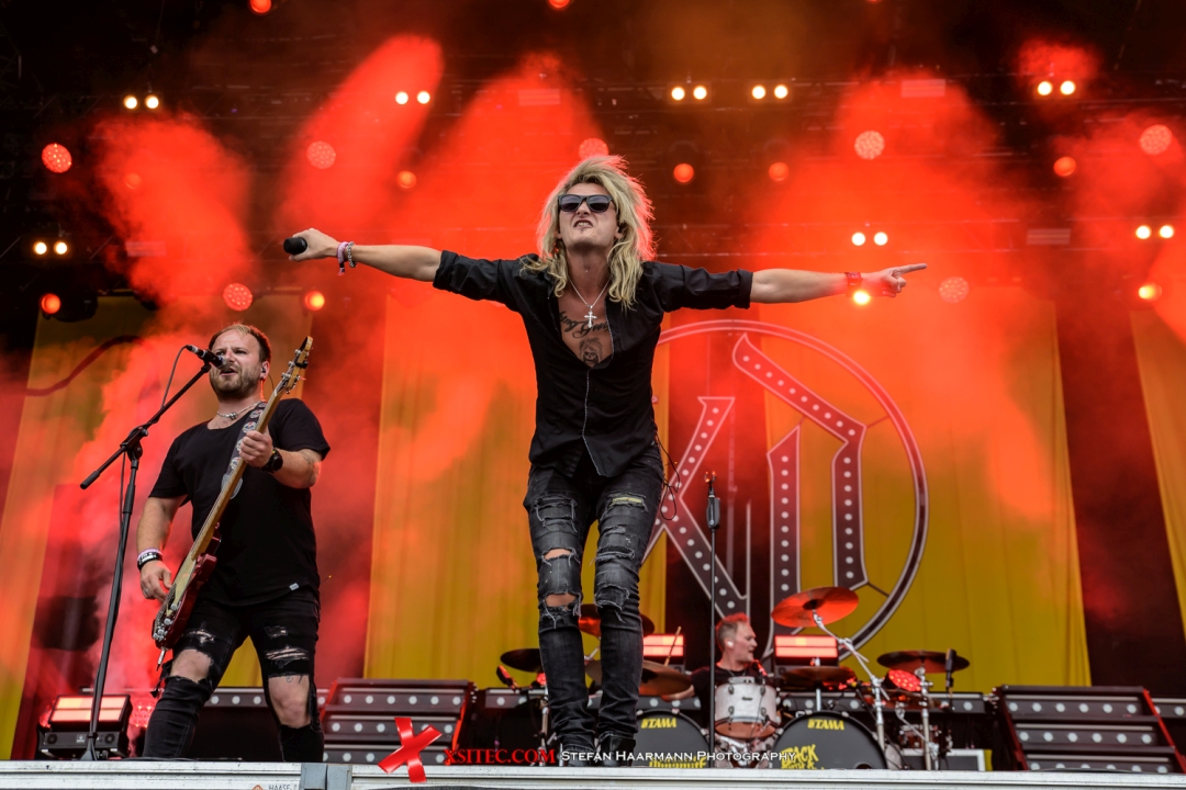 DYING FETUS machen dort weiter, wo die Waffenbrüder von BENEDICTION aufgehört haben: Death Metal der härtsten Sorte wird gehämmert, während das Infield mit ungezählten Circlepits die Stimmung hält und sogar noch zu steigern weiß und nebenan im Mutantenstadl die Übertragung des EM Spiels Spanien vs. Deutschland deutlich weniger Zuschauer begeistern kann. Danach sind die Bogenschützen an der Reihe. UNLEASH THE ARCHERS zaubern trotz Jetlag einen schmackhaften Power Metal auf die Bühne, KISSIN´ DYNAMITE | ROCKHARZ 2024während die Show von KISSIN´ DYNAMITE zur Demonstration im besten Wortsinn gerät. „Back With A Bang“ heißt die just an diesem Tag veröffentlichte, neue Scheibe der Band, die mit einer ausgeklügelten Show in BON JOVI-Manier standesgemäß gefeiert wird. Hannes Braun geizt wie immer nicht mit diversen Posings – nein – auch seine Bandkollegen Ande Braun (Gitarre), Jim Müller (Gitarre), Steffen Haile (Bass) und Sebastian Berg (Schlagzeug) posieren zunächst auf dem Podest, bevor auch der Rest der Bühne in Beschlag genommen wird und man hier mal zu zweit oder zu dritt dem Publikum eine tolle Show bietet. Die Songs des neuen Albums schlagen ein wie es der Titel vermuten lässt: mit einem „Bang“. Das, was die Schwaben hier auf die Bühne bringen ist von internationalem Format und in dieser Form unwiderstehlich. Chapeau!AMARANTHE | ROCKHARZ 2024