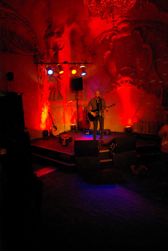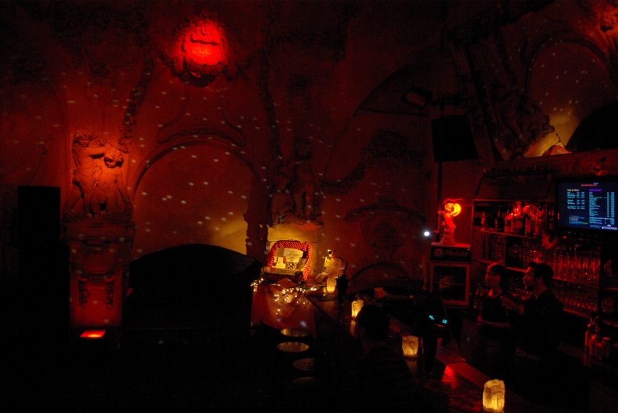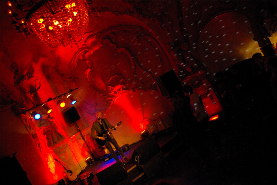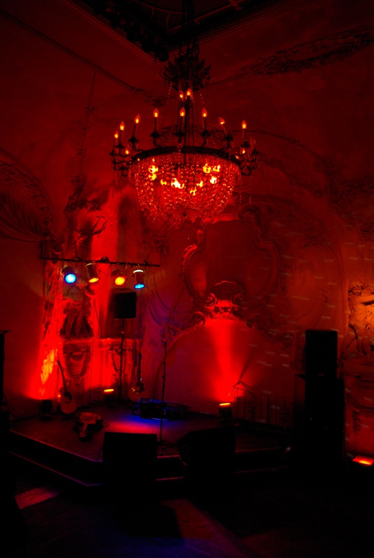 Lichtreflexe einer Spiegelkugel wie Sterne huschen. Ein Kronleuchter verströmt schwache Helligkeit und ein riesiger, von Weinreben umrankter Spiegel über der Bar reflektiert die in roten Schummer getauchte Grotte. Gemütlich ist es hier und entsprechend willkommen sind den gerade einmal fünfzig Gästen die Barhocker und Sofas, die den kleinen Konzertraum umgeben. Dies führt aber leider auch dazu, dass die Fläche direkt vor der kleinen Bühne mehr oder weniger leer bleibt.