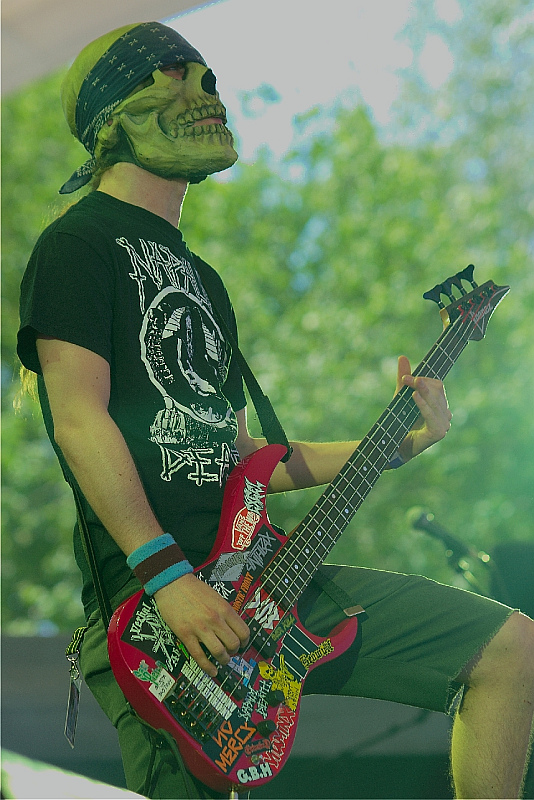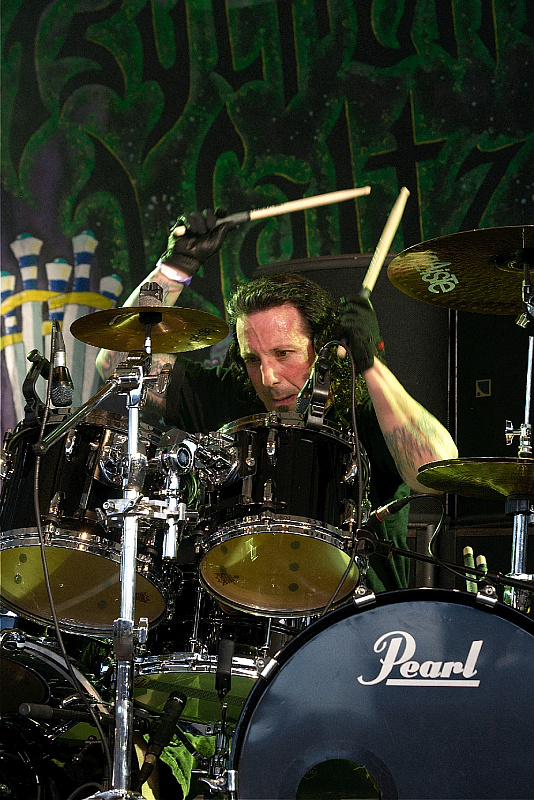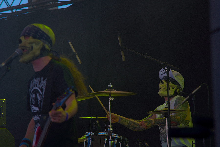Dr. Living Dead!Das originellste Intro des Festivals lassen DR. LIVING DEAD! laufen: IRON MAIDENs UFO-Cover "Doctor, Doctor" (mit Blaze Bayley) gefolgt von einem unbekannten Hardrock-Song, der nahtlos ins Intro von "World War 9" übergeht. Damit tritt die Gruppe um Gitarrist Dr. Toxic (auch Undergång) eine kurzweilige Reise zurück in die Ära des Thrashcore an. Die Schweden mit den Totenmasken und den hochgezogenen weißen Strümpfen kaschieren mit schnörkellosen Songs und gehöriger Energie, dass sie weder über die Finesse der SUICIDAL TENDENCIES verfügen, noch brachialen Überschall kultivieren, wie etwa D.R.I., oder technisch auftrumpfen können wie NASTY SAVAGE, die mehr oder weniger für "Dead End Life", "Streets Of Doc Town" oder "Gremlin's Night" Pate gestanden haben dürften. Allerdings klingt die Chose live wie auf Platte sympathisch, und würden die eine oder andere längere Pause zwischen den Songs das Programm nicht zerfasern und wäre es nicht so früh am Tag, gäbe es vermutlich Arbeit für die souveräne Security. (AS)