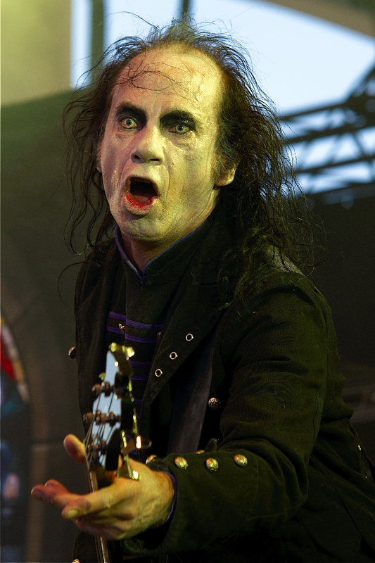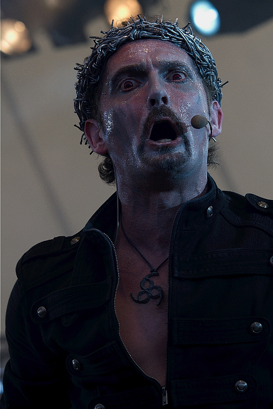 Man durfte gespannt sein, wie HELL auf dem RHF funktionieren würden. Nicht nur, weil es sich bei den Briten um Produzent und Gitarrist Andy Sneap trotz ihres vielbeachteten Debüts um eine einwandfreie Lieben-oder-Hassen-Band handelt, sondern auch, da die optische Darstellung einen nicht unerheblichen Anteil am höllischen Gesamtpaket hat. Und da könnte bei einem Open Air bei einer Spielzeit am frühen Nachmittag und bei strahlendem Sonnenschein einiges an Reiz und Ausdruckskraft verlorengehen. Nach der Spannung aufbauenden "Overture (Themes From 'Deathsquad')" erweisen sich diese Zweifel aber schnell als unbegründet - zumindest, wenn man sich dazu entschieden hat, den zu Beginn vor der Bühne noch ausreichend vorhandenen Platz zu nutzen und sich in Augenkontakt zur Band zu begeben. Von dort kann die Show auch ohne großartige Lightshow beeindrucken und man das Metal-Theater, das auf der Bühne mit den aufgestellten Kirchenfenstern mit den ketzerischen Abbildungen stattfindet, uneingeschränkt verfolgen. Und das lohnt sich. HellDie ersten Töne der einlaufenden Saitenfraktion in ihrer weißgekalkten Vampiroptik von "Let Battle Commence" lassen bereits einen sehr guten Sound erwarten, bevor Sänger David Bower mit seiner Dornenkrone erscheint und mit eindringlichem Blick durch seine roten Pupillen sämtliche Aufmerksamkeit auf sich zieht. Durch sein Kopfmikro genießt er volle Bewegungsfreiheit, die er für seine gestenreiche Performance nutzt. Die Theatralik, mit der er seinen stechenden, absolut fehlerfreien Gesang unterstreicht, wirkt anfangs völlig überzogen, aber nach kurzer Eingewöhnung passt sie einfach perfekt zur Musik. Seine Bandkollegen machen optisch ebenfalls einiges her: Bassist Tony Speakman guckt wie Frankensteins Monster aus der Wäsche und Gitarrist und Keyboarder Kev Bower ist mit seinen Dreadlocks zur Leichenblässe sowieso eine ungewöhnliche Erscheinung. Aber vor allem setzt der gruselige Fünfer das erstklassige Songmaterial vom "Human Remains"-Album absolut überzeugend um und erweist sich als perfekt eingespielt. "On Earth As It Is In Hell" enthält sowieso eines der geilsten Riffs der letzten Jahre und auch die folgenden Gitarrengewitter sind großes Kino, äh, Theater. Hauptakteur bleibt dabei aber stets der schauspielerfahrene Prediger am Bühnenrand, der zu "Plague And Fyre" noch einen maskierten Mönch mit Glocke gibt oder "Blasphemy And The Master" zur blutverschmierten Selbstgeißelung nutzt. "Save Us From Those Who Would Save Us" mit seinem ebenso ungewöhnlichen wie nachhaltigen Refrain beendet dann die eindringliche Show, von der man viele Anwesende kurz darauf am Shirt-Stand bei der Auswahl eines der verschiedenen HELL-Motive wiedertrifft. (LS)