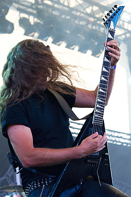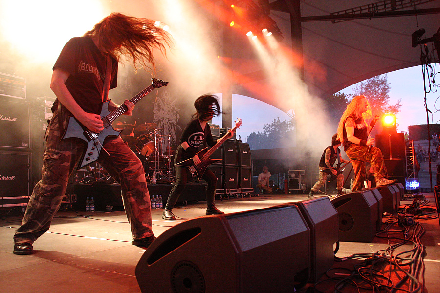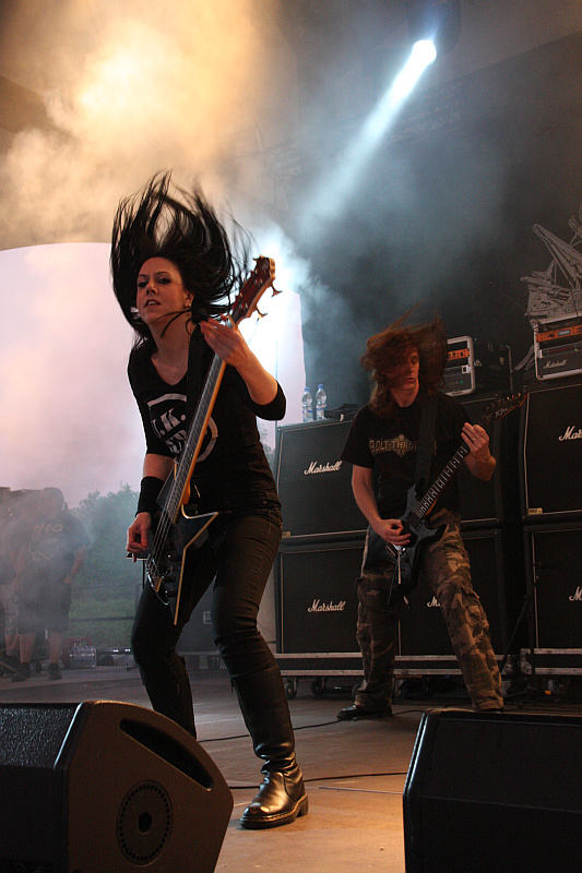Bolt ThrowerDass BOLT THROWER die wahrscheinlich fanfreundlichste Band mit Headlinerstatus ist, wird auch beim Rock Hard Festival deutlich. Am frühen Samstagnachmittag eröffnet die Band ihren eigenen Merchandisestand, an dem alle Shirts (drei Motive für die Damen, sieben oder acht für die Herren) gerade mal zehn oder zwölf Euro kosten. Kein Wunder, dass die Fans stundenlang geduldig Schlange stehen, um ein Leibchen abzugreifen. Um 21:30 Uhr geht es dann auch mit der Panzerfahrt los. Anders kann man das, was die britische Death-Metal-Maschinerie auf der Bühne fabriziert, auch nicht bezeichnen. Mit der Gewalt eines Leopard 2 bricht der brachiale Sound über das Publikum herein. Leider ist das Ganze aber etwas zu basslastig, während die Gitarren im Gesamtsound etwas untergehen. Das geht für einen Headliner klar besser. Die gute Laune lässt man sich davon aber nicht verderben, gegen die mächtigen Grooves kann man sich eh nicht wehren und lässt den Nacken kreisen. Während sich Sänger Karl Willets bester Laune zeigt, ist Bassistin Jo Bench rein optisch das genaue Gegenteil. Ohne auch nur eine Miene zu verziehen, bangt sie sich durch den Set und sorgt dabei für den nötigen Punch. Die Gitarristen Gavin Ward und Barry Thomson sind ebenfalls sehr agil, so dass eigentlich nie Stillstand auf der Bühne herrscht. Musikalisch sowieso nicht, die Setlist besteht aus 16 Songs, deren Highlights "When Glory Beckons", "Mercenary", "IVth Crusade", "Warmaster", "Killchain", "... For Victory" und natürlich "No Guts, No Glory" heißen. Trotz des nicht ganz perfekten Sounds herrscht heute weitestgehend Einigkeit darüber, dass BOLT THROWER ein starker Headliner sind. (ASZ)