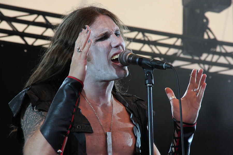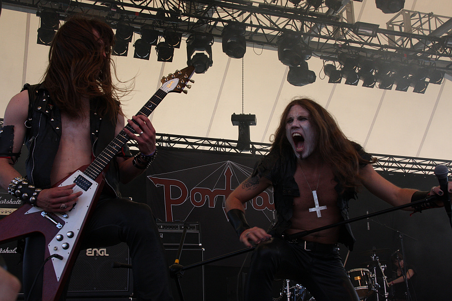 PortraitNach dem bockstarken Gig von MOTORJESUS auf die Bühne zu müssen, ist alles andere als eine leichte Aufgabe. Und wenn man dann noch düsteren 80er-Metal à la MERCYFULE FATE als musikalische Marschrichtung vorgegeben hat, macht dies die Sache im beißenden Sonnenschein nicht einfacher. Wenigstens können PORTRAIT aber im Gegensatz zu RAM gestern auf ihren Soundmann zählen. Perfekt geht zwar anders, aber die edlen Gitarrenmelodien sind deutlich zu vernehmen. Gleiches gilt für den extravaganten Gesang von Sänger Per Karlsson, der die letzte Tour mit EVILE und DR. LIVING DEAD! aus nicht näher bekannten Gründen nicht mitfahren konnte, bei den Festivals aber offensichtlich wieder mit von der Partie ist. Gut so, denn sein Ersatzmann soll Ohrenzeugen zufolge gerne mal neben der Spur gesungen haben. Per hingegen hat die Wechsel zwischen normaler Stimme und dem hohen Falsett prima drauf und überzeugt darüberhinaus mit seiner agilen und auffälligen Performance (und bei den Damen wohl mit seinem Aussehen, zumindest sollen sich zwei seiner Anhängerinnen gar wegen ihm geschlagen haben). Und wenn eine Band mit einem Übersong wie "Infinite Descension" aufwarten kann, hat sie eh schon gewonnen. (ASZ)