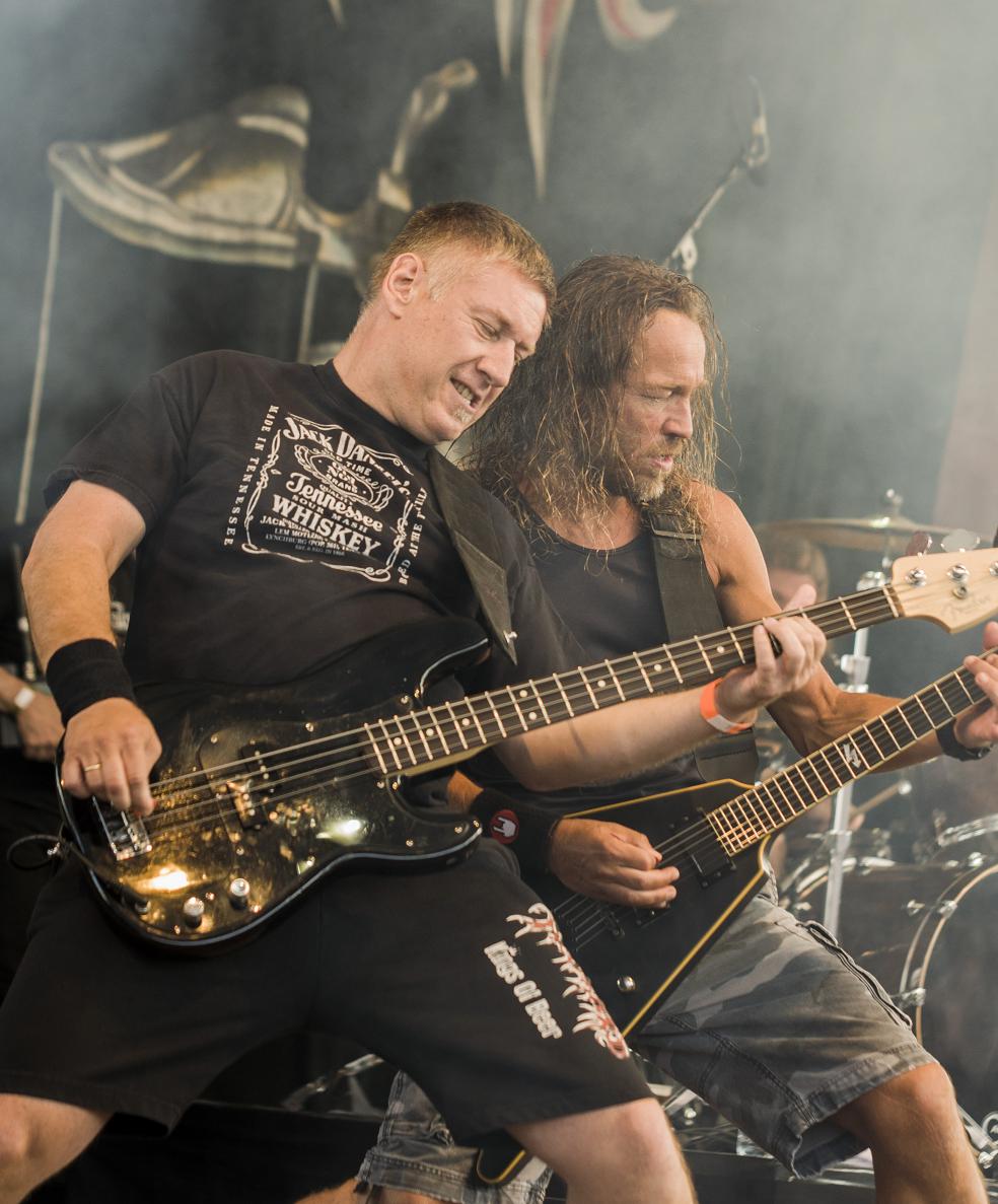 Der Headliner-Auftritt von SODOM ist dann anschließend ein zweischneidiges Schwert. Zunächst mal muss kritisiert werden, dass die Band sowohl zu spät auf die Bühne kommt als auch diese früher wieder verlässt. Da überrascht es auch nicht, dass einige Standards fehlen; es gibt weder "Bombenhagel" noch beispielsweise "Obsessed by Cruelty" oder "Napalm in the Morning" (um mal einen weniger alten Song zu bemühen) zu hören. Auch "Ausgebombt" als alleinige Zugabe wirkt etwas sparsam. Überhaupt wirkt die Band nicht sonderlich motiviert, teilweise beinahe etwas gelangweilt. Das zieht sich aber immerhin nicht durch den kompletten Auftritt, da man zumindest Chef Tom Angelripper ab und an mal sowas wie Freude ansieht, wenn die Klassiker in den vorderen Reihen euphorische Reaktionen verursachen. Die Auswahl der Stücke, die tatsächlich gespielt werden, ist soweit ausgewogen und enthält eigentlich keine Ausfälle, allerdings (und das ist letztlich ein persönlicher Kritikpunkt) wirken die alten Rumpelnummern wie "Blasphemer" (mit Unterstützung von Ex-Gitarrist Grave Violator) oder "Outbreak of Evil" heutzutage irgendwie zu professionell, was besonders an Drummer Markus Freiwald liegt. Dadurch geht einiges an Charme verloren, der das Uralt-Songmaterial nun mal zu großen Teilen ausmacht. Im Endeffekt bieten die Ruhrpottler keine schlechte Unterhaltung, ob das ganze jedoch Headliner-würdig ist, steht auf einem anderen Blatt. (LH)