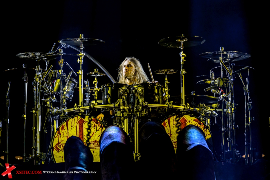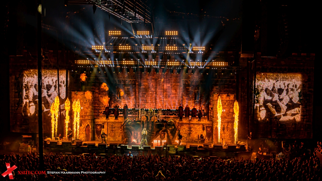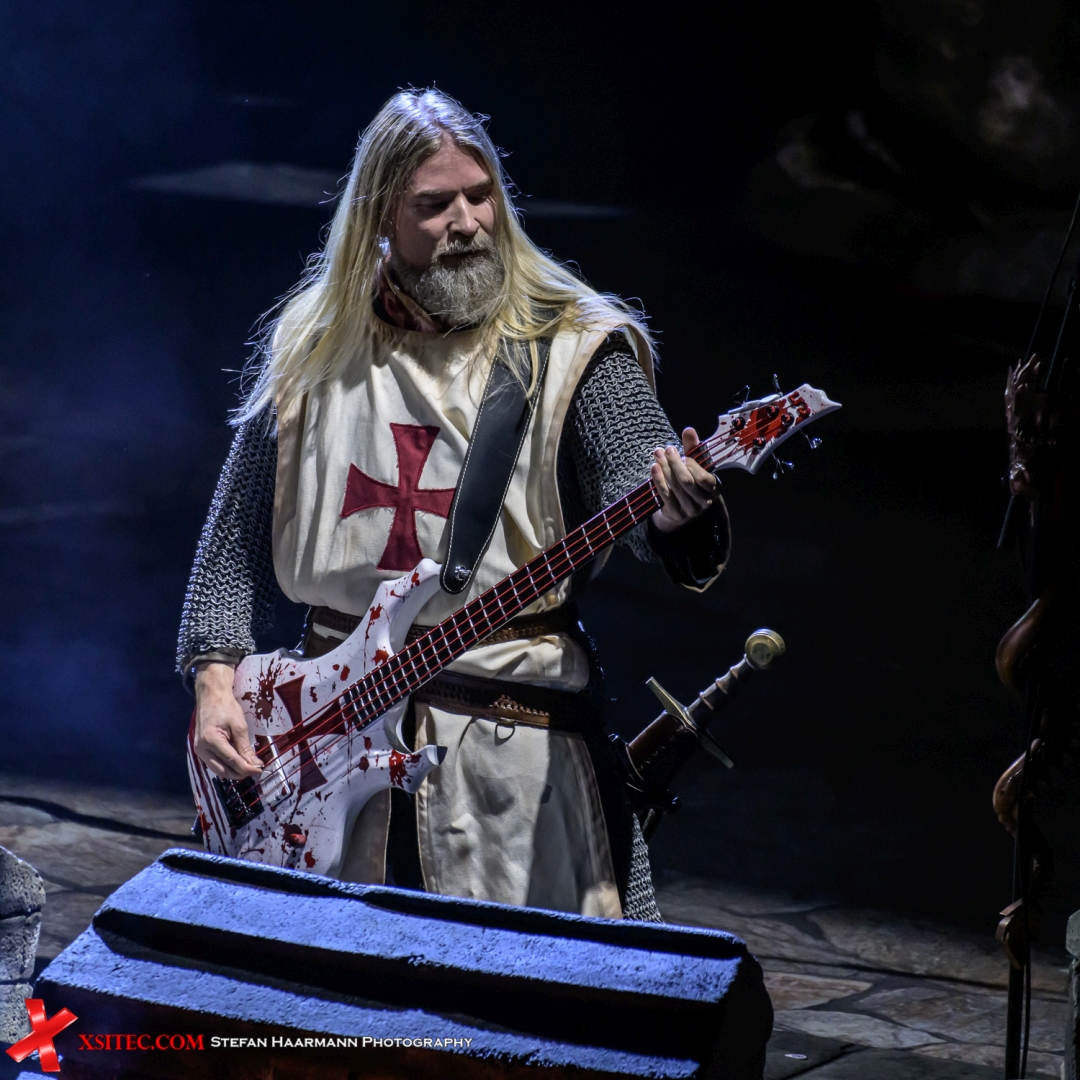 Das ganze spielt sich auf der Nebenbühne ab, die wie bereits oben erwähnt bei Bedarf durch eine mächtige Hängebrücke mit der Hauptbühne verbunden werden kann. Als dann endlich die eigentlichen Hautdarsteller aus dem Off erscheinen, brandet unglaublicher Jubel auf, der die Band bei „Templars“ in ohrenbetäubendem Jubel baden lässt. Im Laufe des Songs wechseln die in Templer-Gewänder gehüllten Mannen um Frontmann Joakim Brodén über die Zugbrücken auf die Hauptbühne, auf der bereits Schlagzeuger Hannes Van Dahl sehnsüchtig auf seine Mitstreiter wartet. Somit ist dann das folgendende „The Last Stand“ auch nicht wörtlich zu nehmen, da alle SABATON Musiker nun vereint die Halle aufmischen. Neben Joakim Brodén und Hannes Van Dahl greifen an diesem Abend Thobbe Englund (Gitarre), Chris Rörland (Gitarre), sowie Pär Sundström (Bass) zu den Instrumenten.